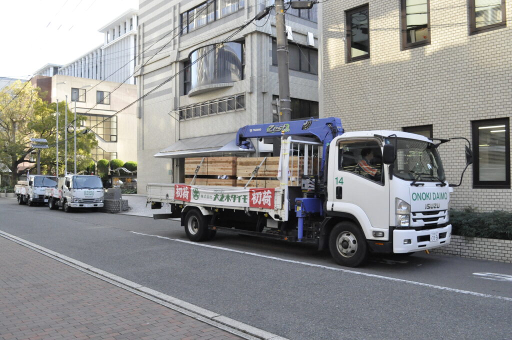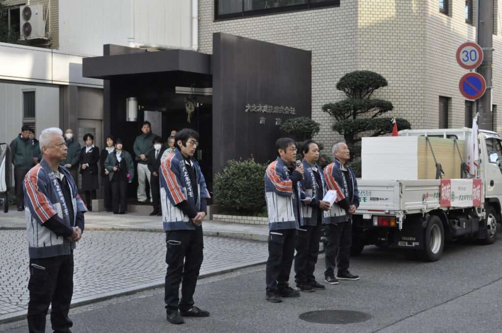 小兵衛社長の挨拶や木材事業部の社員の挨拶ののち、一同に見守られながら今年の初荷を載せたトラックが出発していきました。