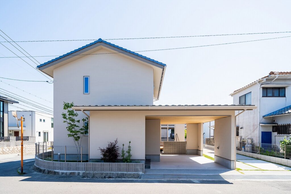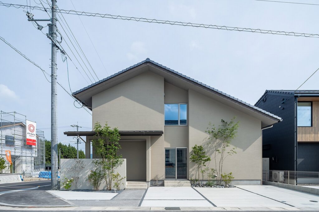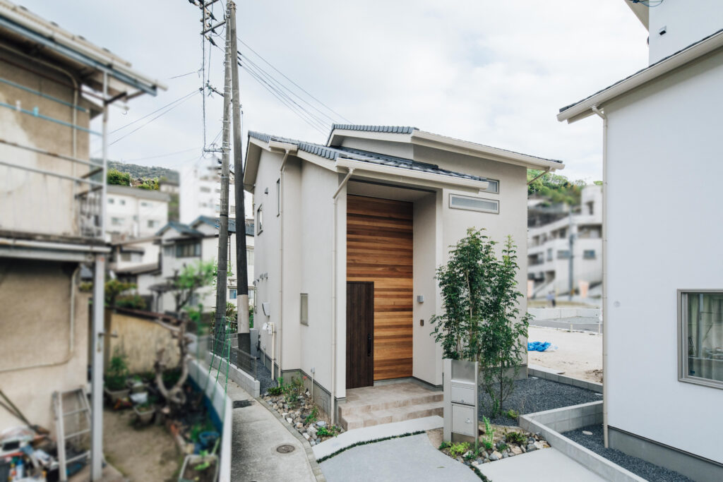 新しい分譲団地に建つことを考え、住む人のプライバシーが守れるよう正面に壁をつくった外観デザインや