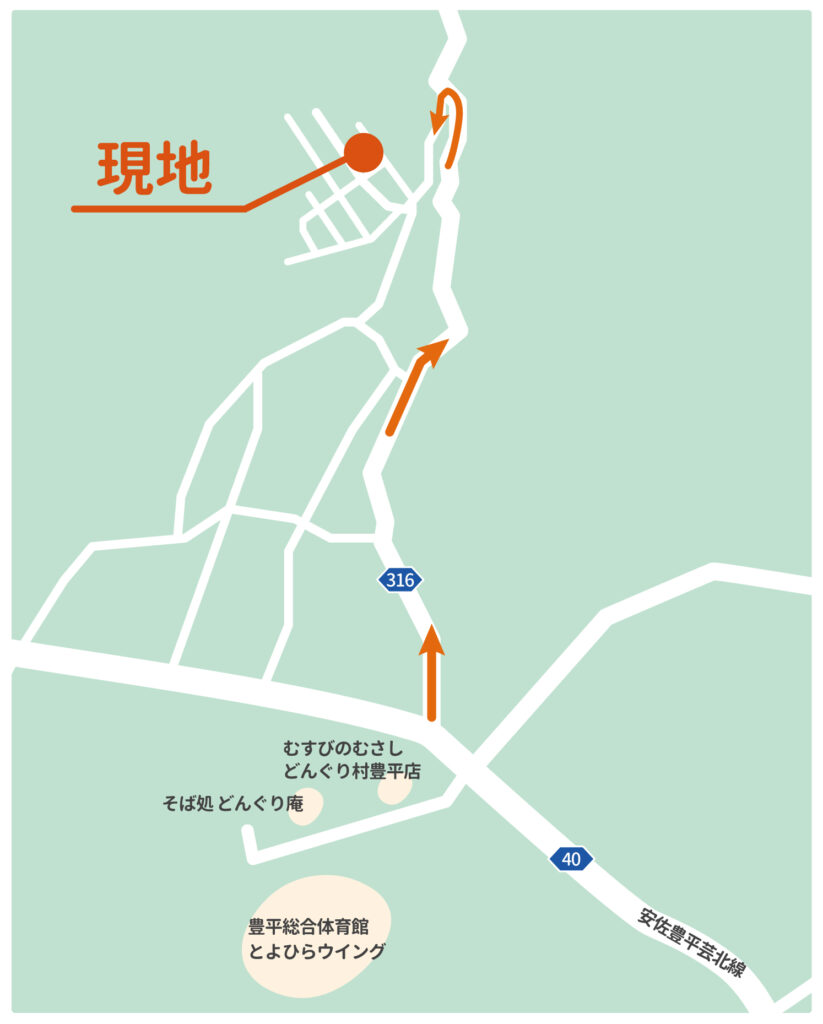 広島北ICで降り、県道191号、261号、40号を北上し、旧豊平町までお進みください。