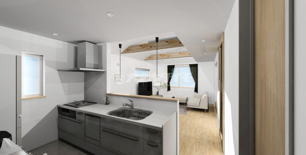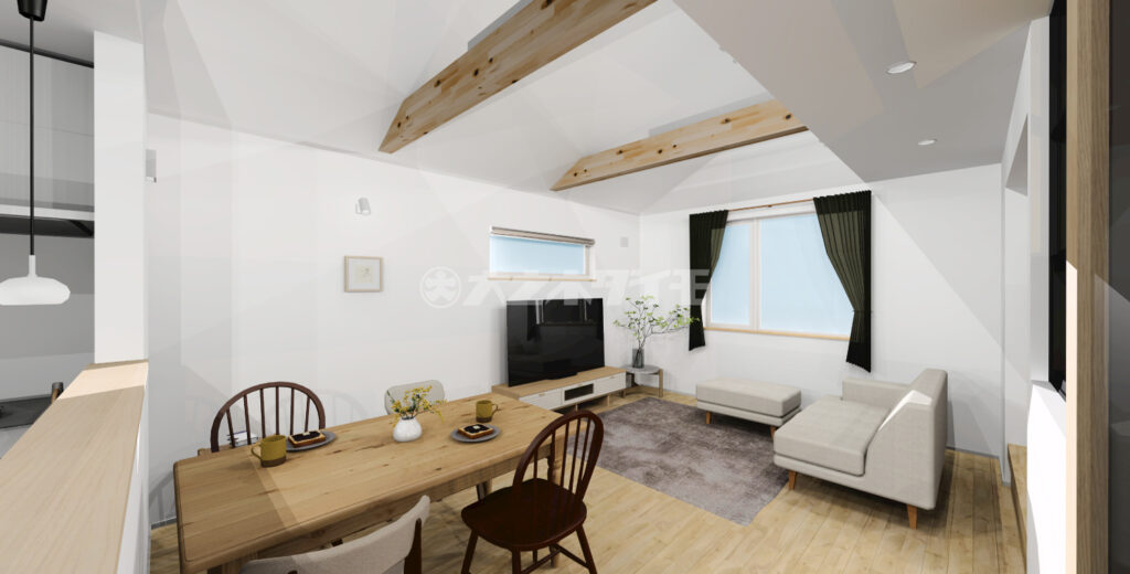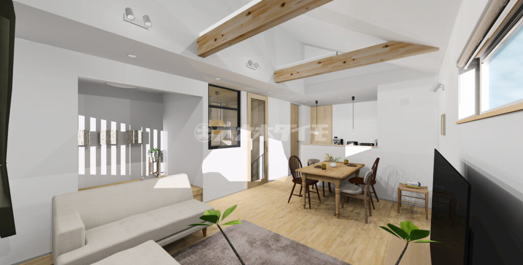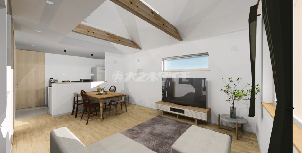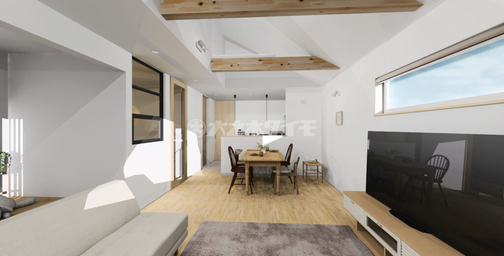勾配天井にすることで16帖でも開放的に感じられるよう工夫しています