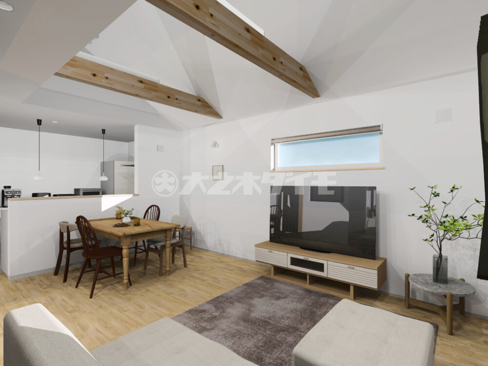 勾配天井にすることで16帖でも開放的に感じられるよう工夫しています