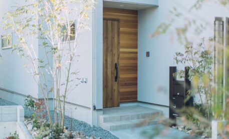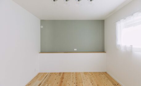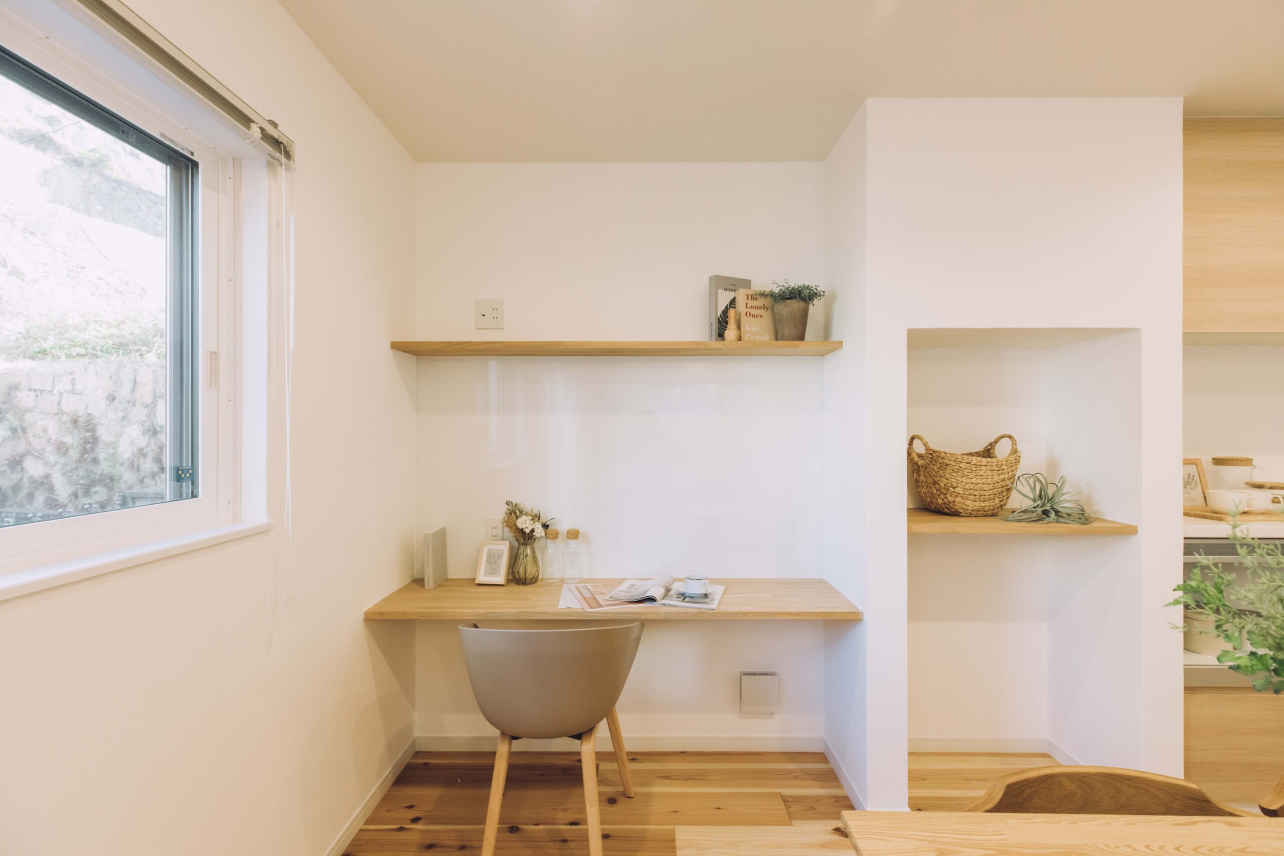 呉市街にほど近い住宅街の一角。 駐車スペースから少し高低差のある敷地に建つため、窓の大きさや位置など、プライバシーを保ちながらも家族がのびのびと暮らせるよう工夫している。 2階の書斎は、瀬戸内海の景色を遠くに望むことができるこの家一番の特等席。こもり感がありながらも、視線の抜ける開放的な空間になった。 外観は柔らかなブルーグレーの塗り壁、室内は明るいナチュラル色で統一。かわいらしさと温かみのある家に仕上がった。