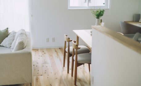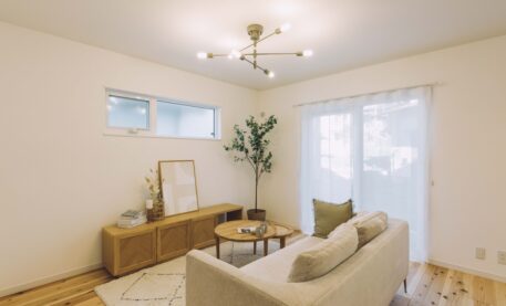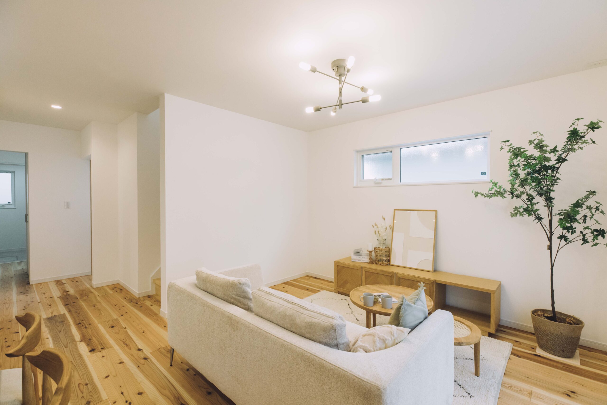 真っ白な漆喰とナチュラルな色の杉フローリングで全体的に明るくまとめたリビング。 隣の家に面した窓は高い位置に型ガラスで設けることで、カーテンがなくても気にならず、柔らかい光を取り込める。 造作のカウンターもあり、様々なシーンで家族の会話も弾みそう。