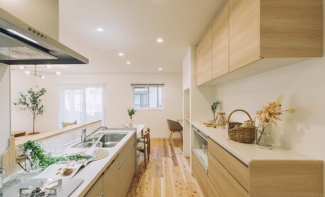 玄関から入ってすぐの対面式のキッチン。家族にすぐ声かけができるので安心できる間取りになっている。買い物から帰宅してすぐに冷蔵庫やパントリーに収納できるのも◎ キッチンとダイニングは横並びに配置。配膳がしやすいだけでなく、ぐるりと回れる回遊動線にすることで、行き止まりがなく調理や片付けのストレスもかかりにくい。