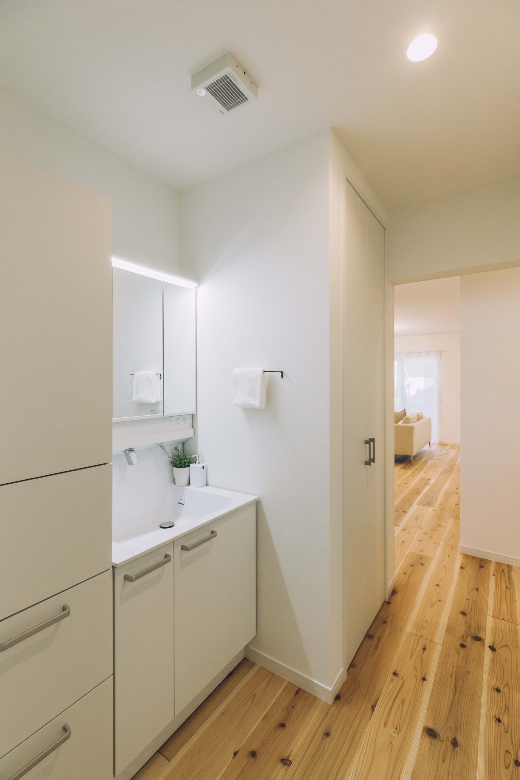 脱衣室と分かれている洗面コーナー。誰かがお風呂に入っていても気にせず洗面化粧台を使うことができる。横に扉付きの収納がついたタイプを採用しているので、タオルや洗面用品などを家族それぞれで仕舞っておける。近くにも扉のある収納があり、掃除道具や日用品をストックできて便利。 玄関からすぐの場所にあるので、手洗いうがいの習慣が自然と身につきそう。