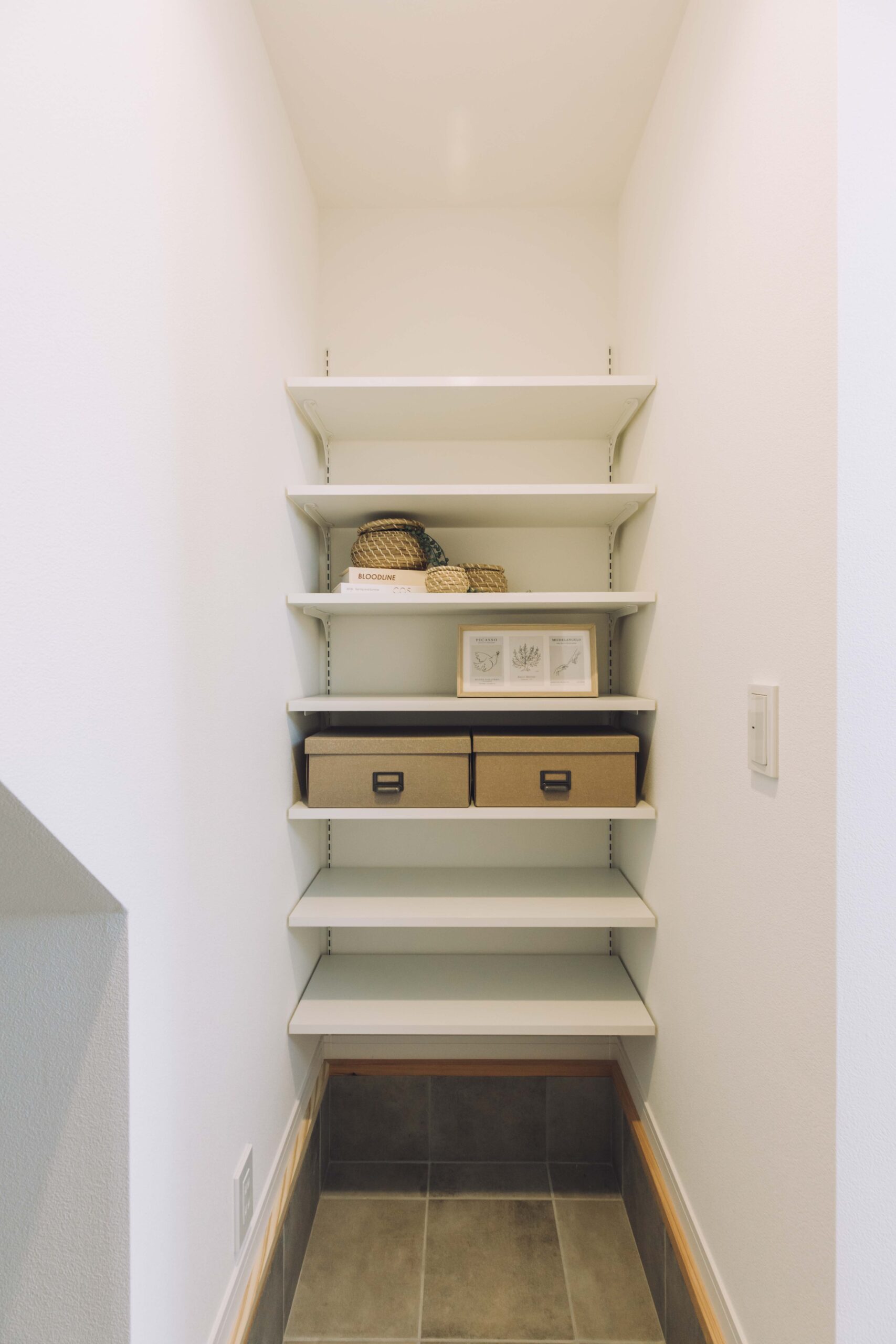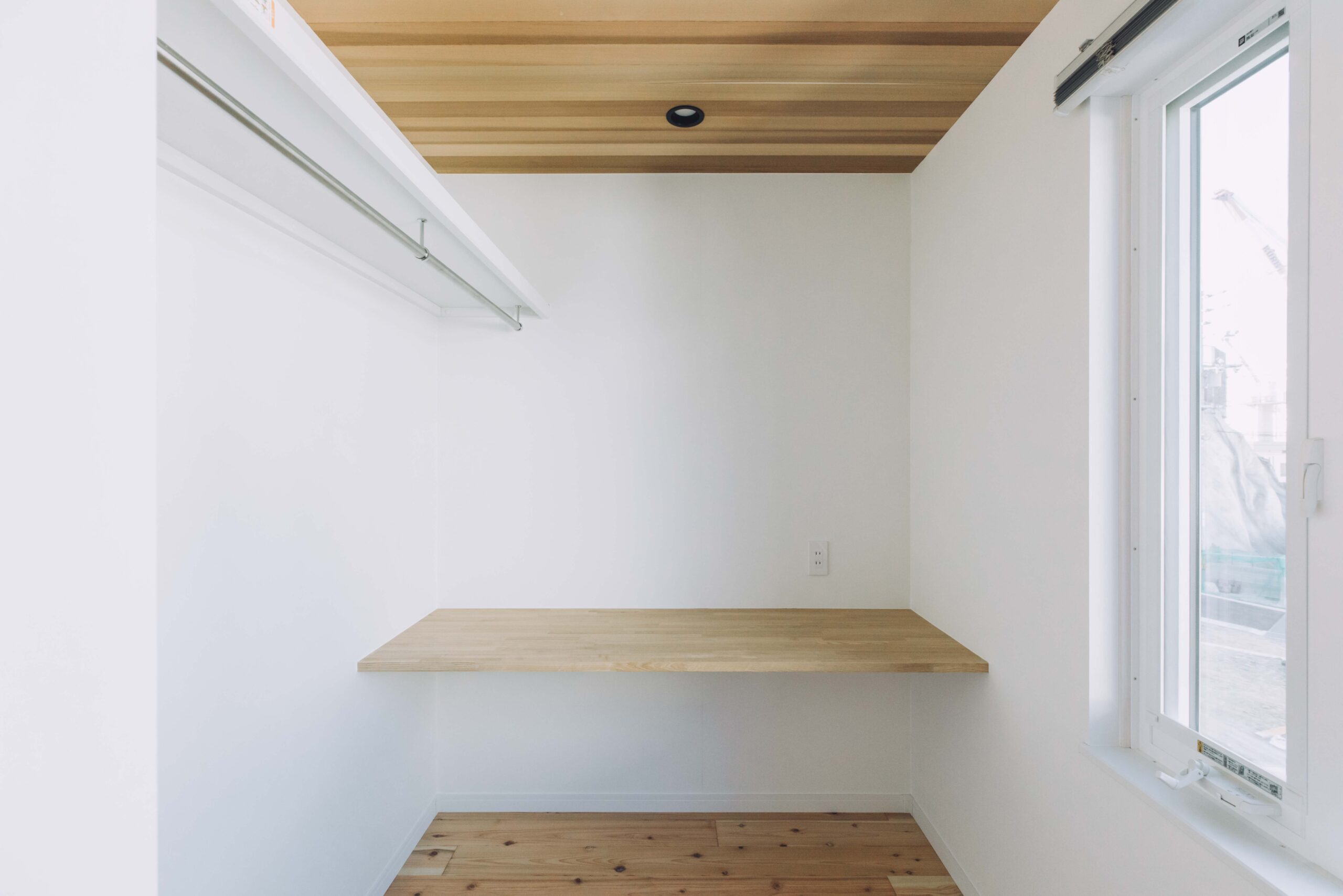 水回りの近くにWICを作り、2階まで洗濯ものを持って上がる手間を削減。日々使う着替えや衣類など、必要なものを置いておけば家事動線も短縮できる。扇風機、ストーブなど季節の家電もそのまま収納しておける。