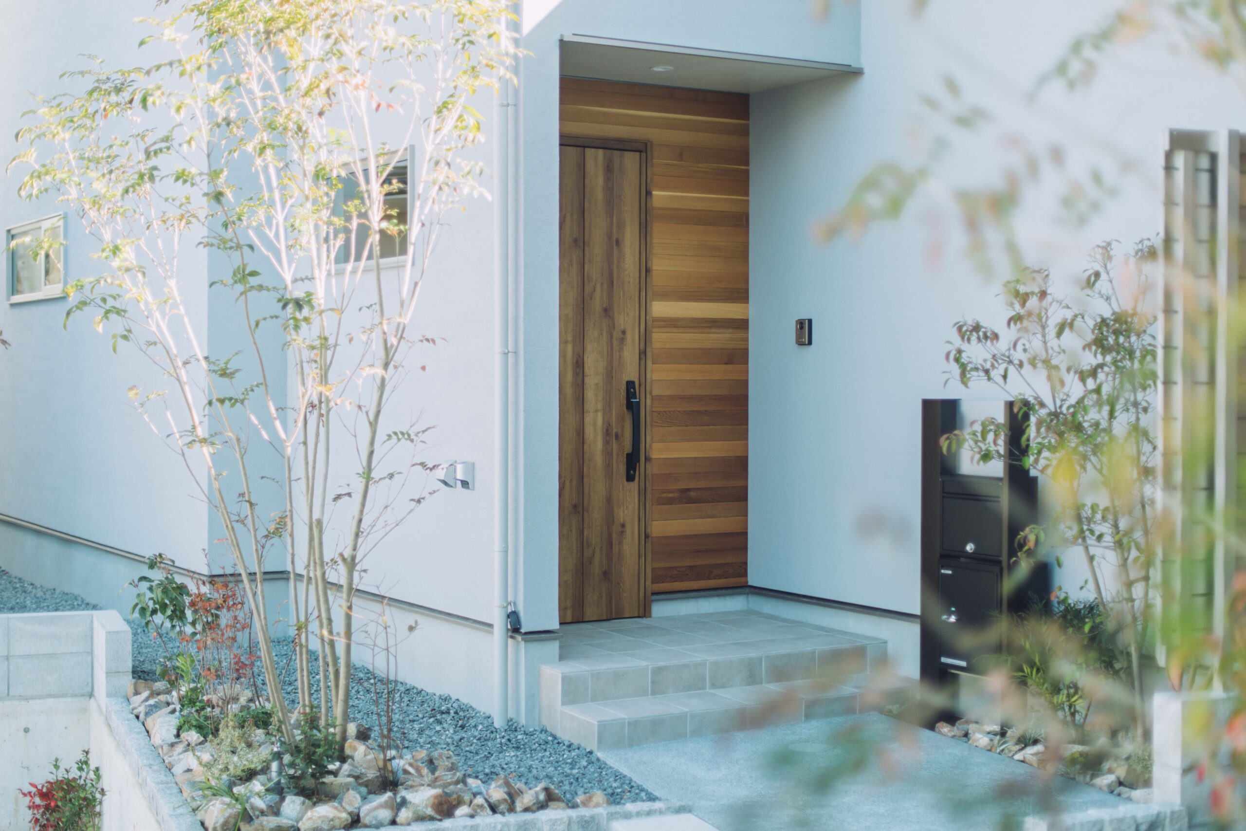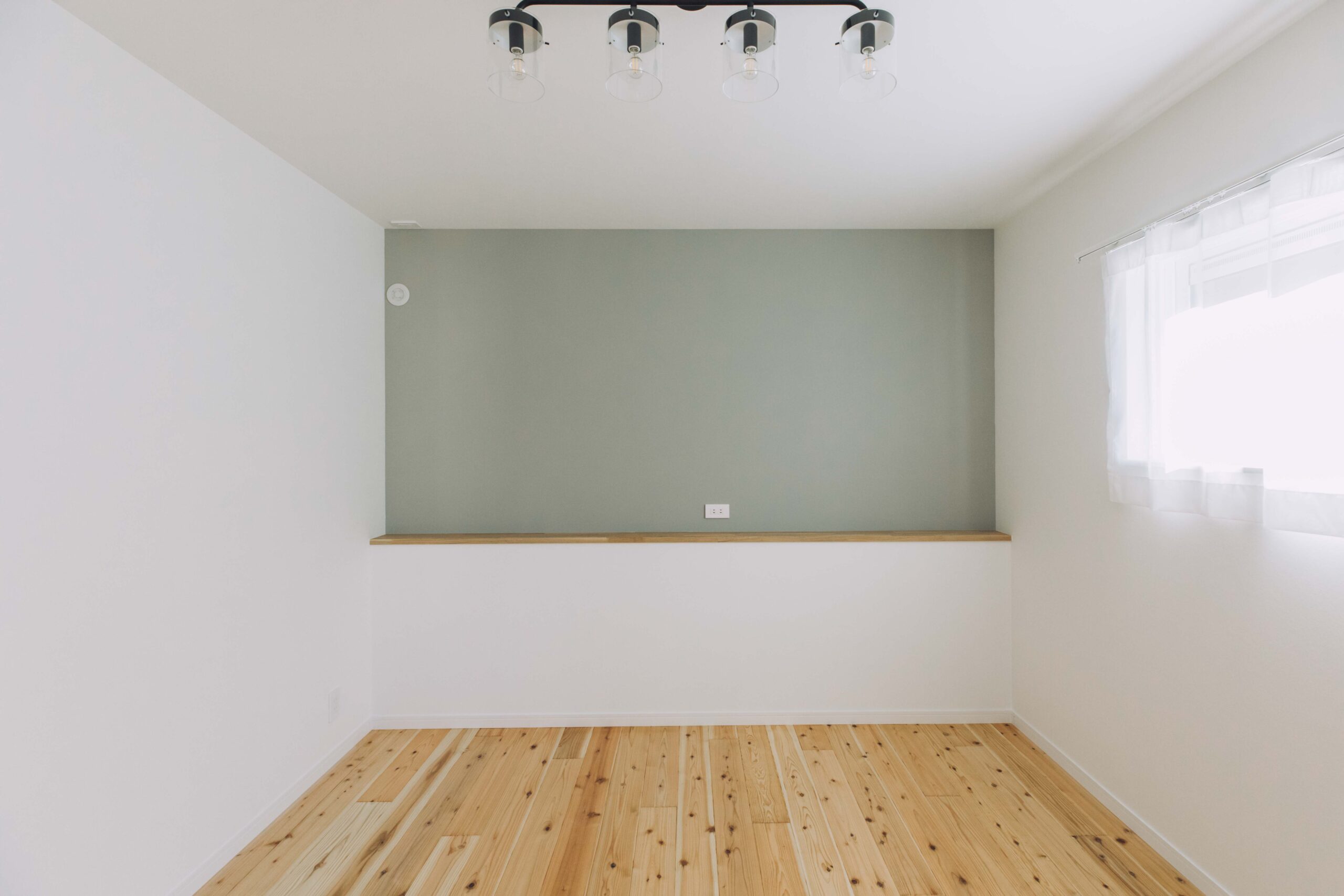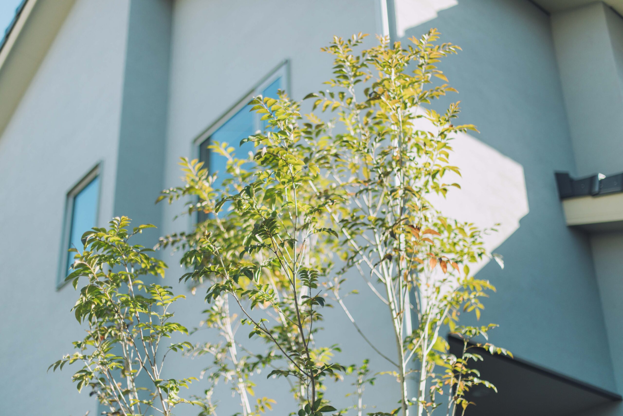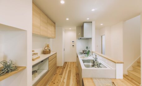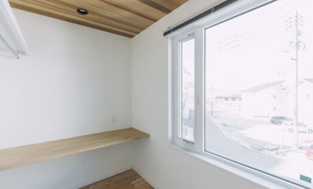 呉市街にほど近い住宅街の一角。 駐車スペースから少し高低差のある敷地に建つため、窓の大きさや位置など、プライバシーを保ちながらも家族がのびのびと暮らせるよう工夫している。 2階の書斎は、瀬戸内海の景色を遠くに望むことができるこの家一番の特等席。こもり感がありながらも、視線の抜ける開放的な空間になった。 外観は柔らかなブルーグレーの塗り壁、室内は明るいナチュラル色で統一。かわいらしさと温かみのある家に仕上がった。