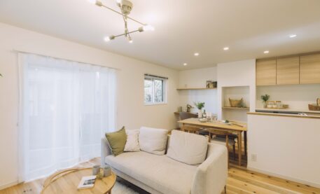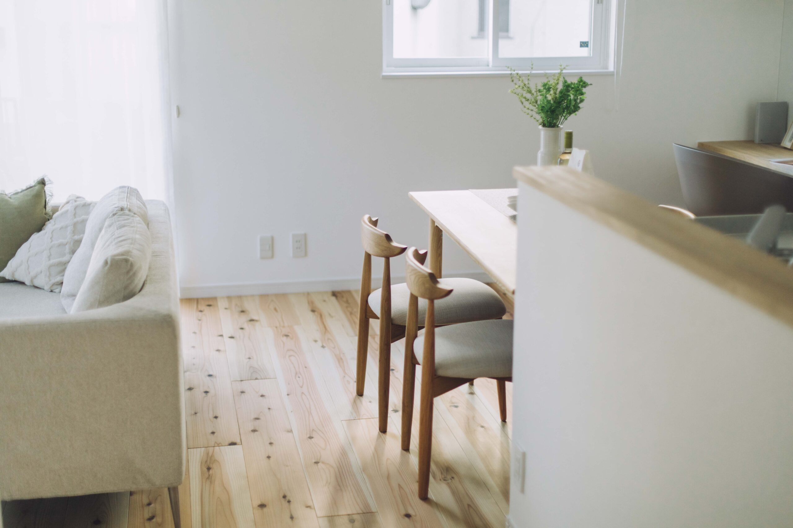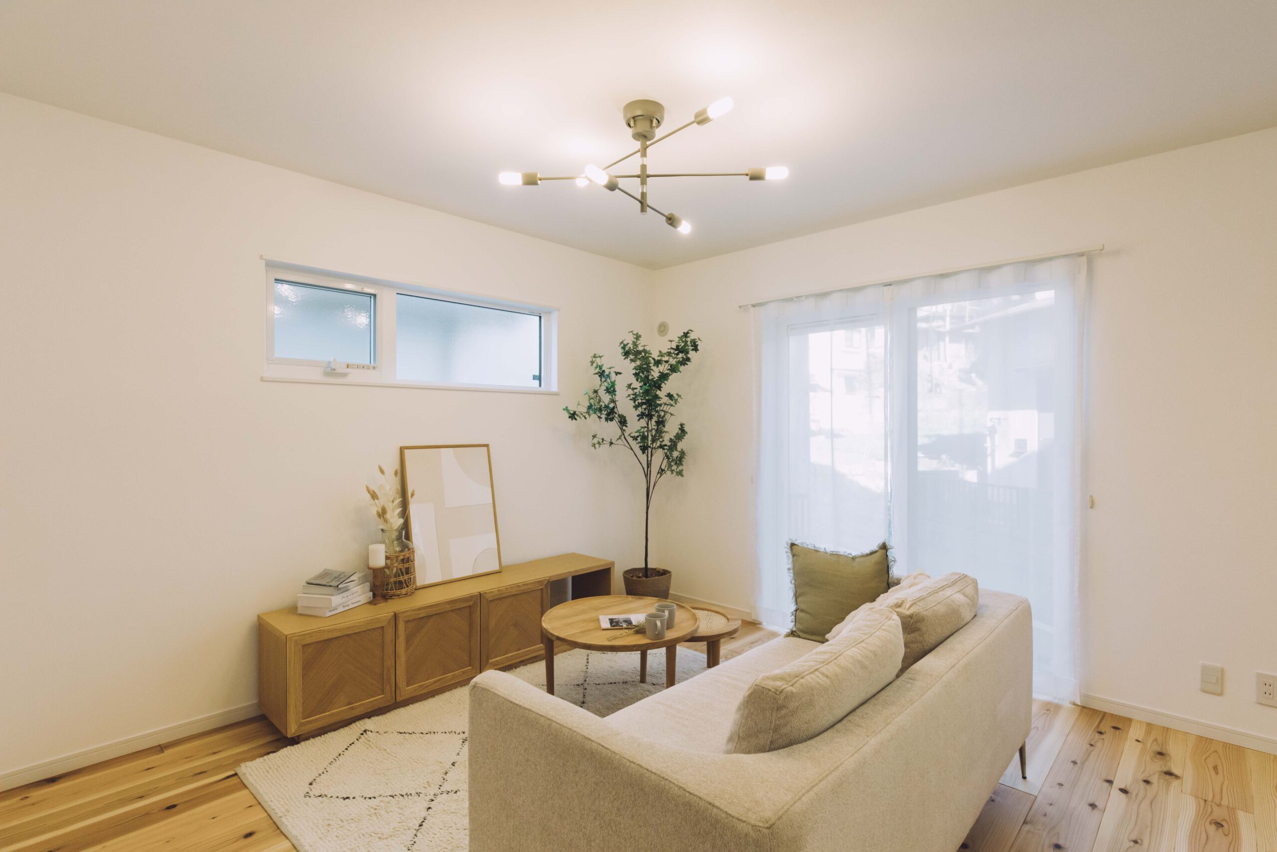 真っ白な漆喰とナチュラルな色の杉フローリングで全体的に明るくまとめたリビング。 隣の家に面した窓は高い位置に型ガラスで設けることで、カーテンがなくても気にならず、柔らかい光を取り込める。 造作のカウンターもあり、様々なシーンで家族の会話も弾みそう。