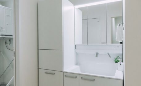 脱衣室と分かれている洗面コーナー。誰かがお風呂に入っていても気にせず洗面化粧台を使うことができる。横に扉付きの収納がついたタイプを採用しているので、タオルや洗面用品などを家族それぞれで仕舞っておける。近くにも扉のある収納があり、掃除道具や日用品をストックできて便利。 玄関からすぐの場所にあるので、手洗いうがいの習慣が自然と身につきそう。