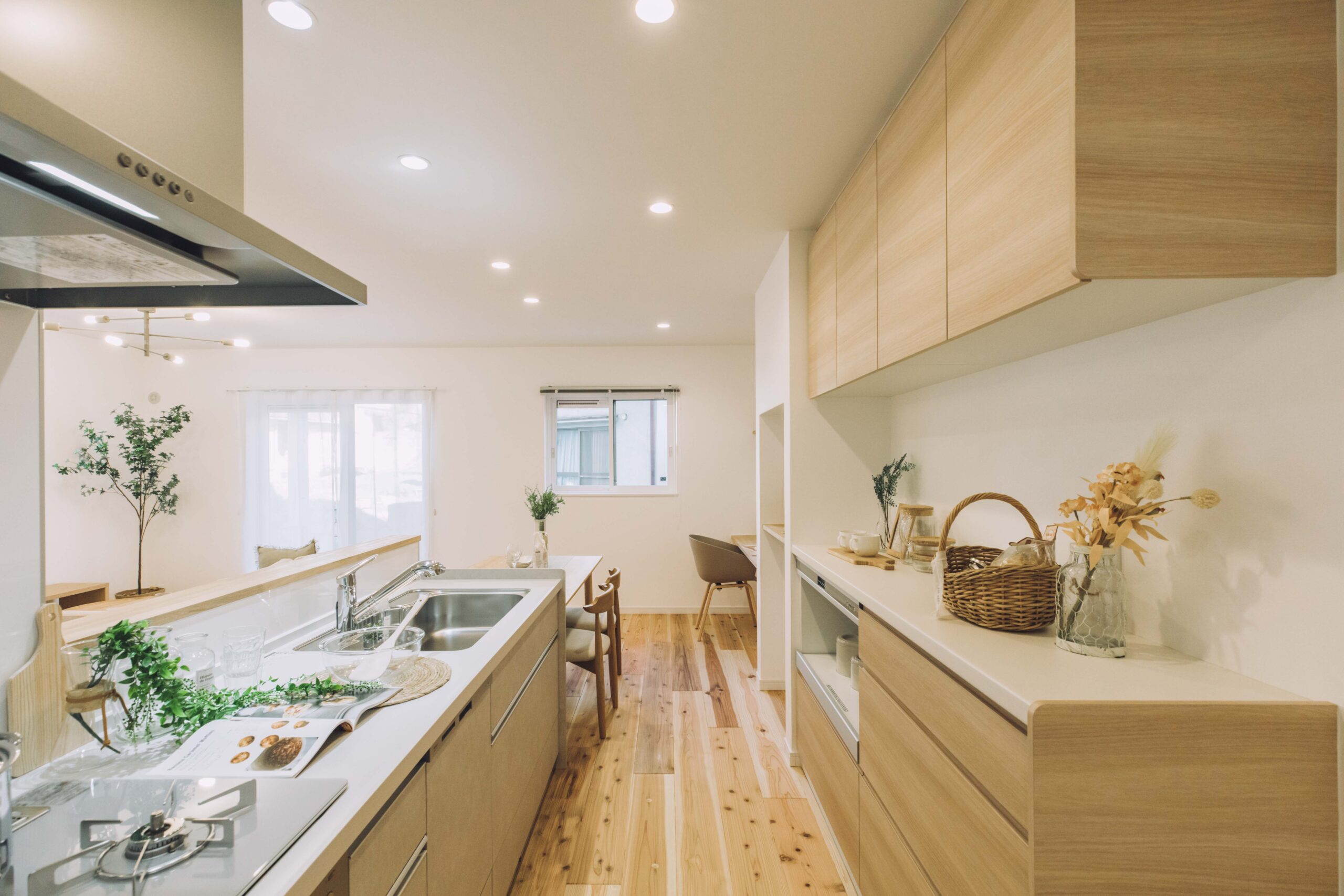 玄関から入ってすぐの対面式のキッチン。家族にすぐ声かけができるので安心できる間取りになっている。買い物から帰宅してすぐに冷蔵庫やパントリーに収納できるのも◎ キッチンとダイニングは横並びに配置。配膳がしやすいだけでなく、ぐるりと回れる回遊動線にすることで、行き止まりがなく調理や片付けのストレスもかかりにくい。