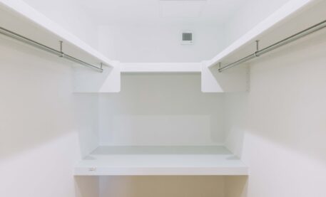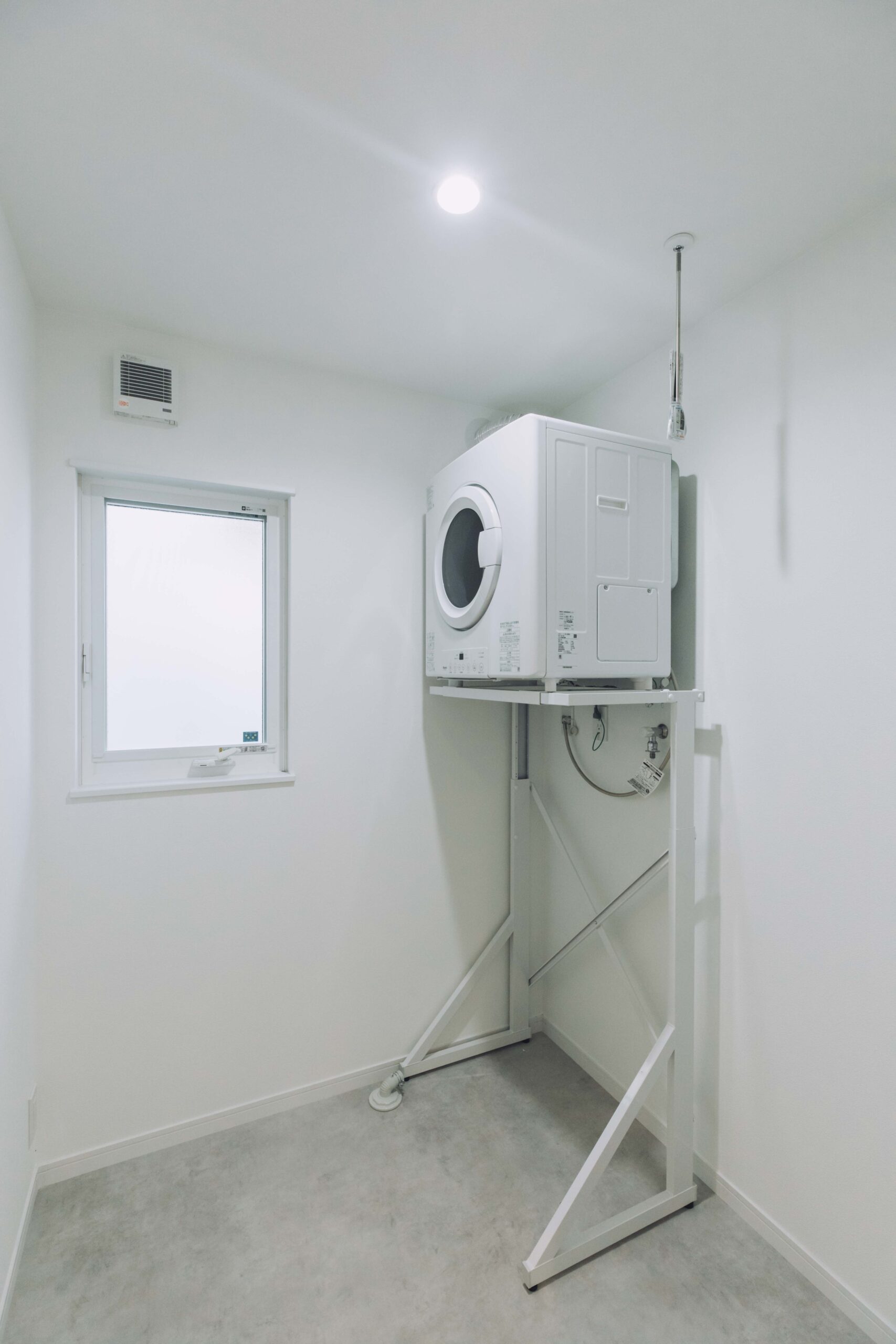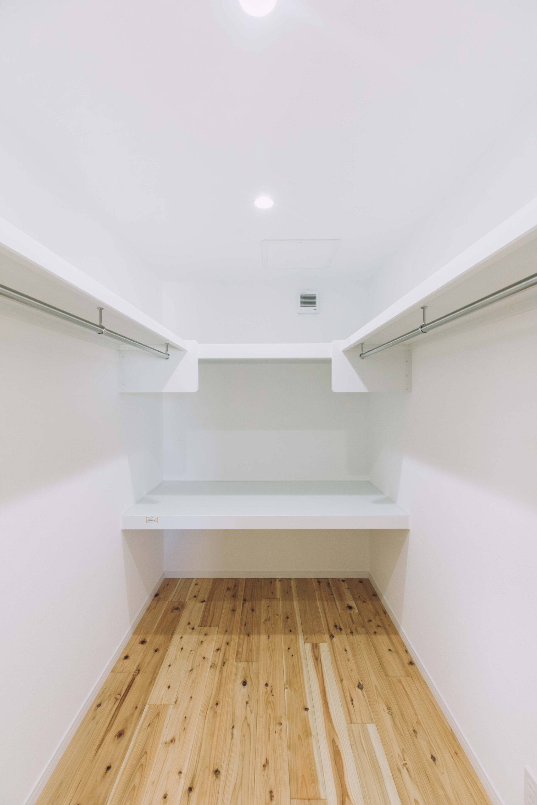 水回りの近くにWICを作り、2階まで洗濯ものを持って上がる手間を削減。日々使う着替えや衣類など、必要なものを置いておけば家事動線も短縮できる。扇風機、ストーブなど季節の家電もそのまま収納しておける。