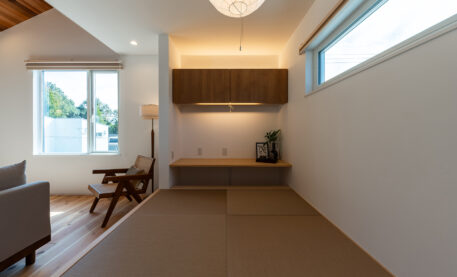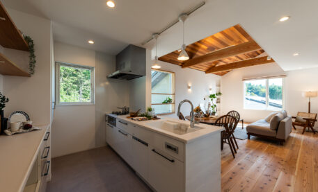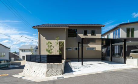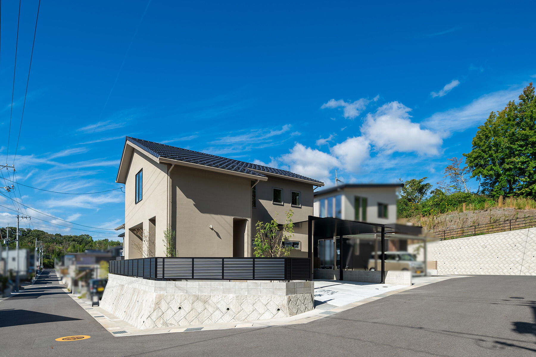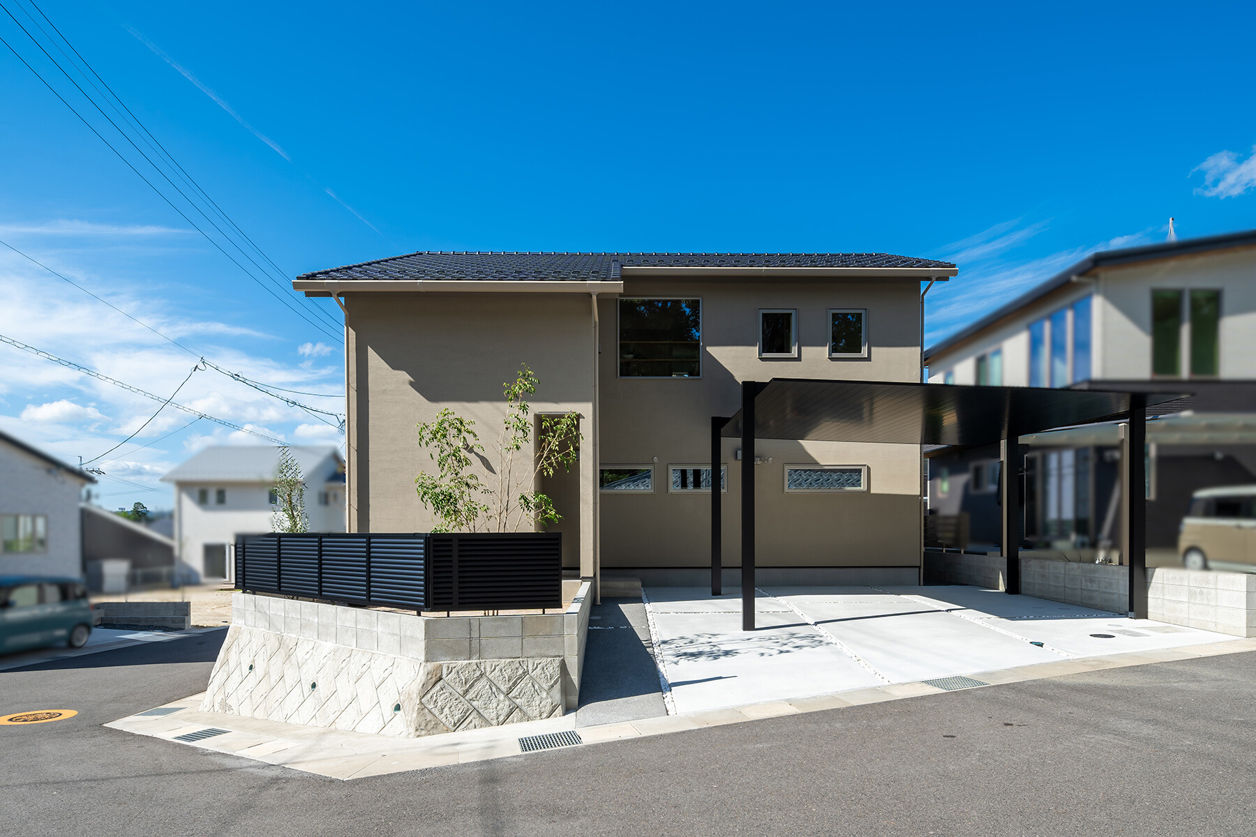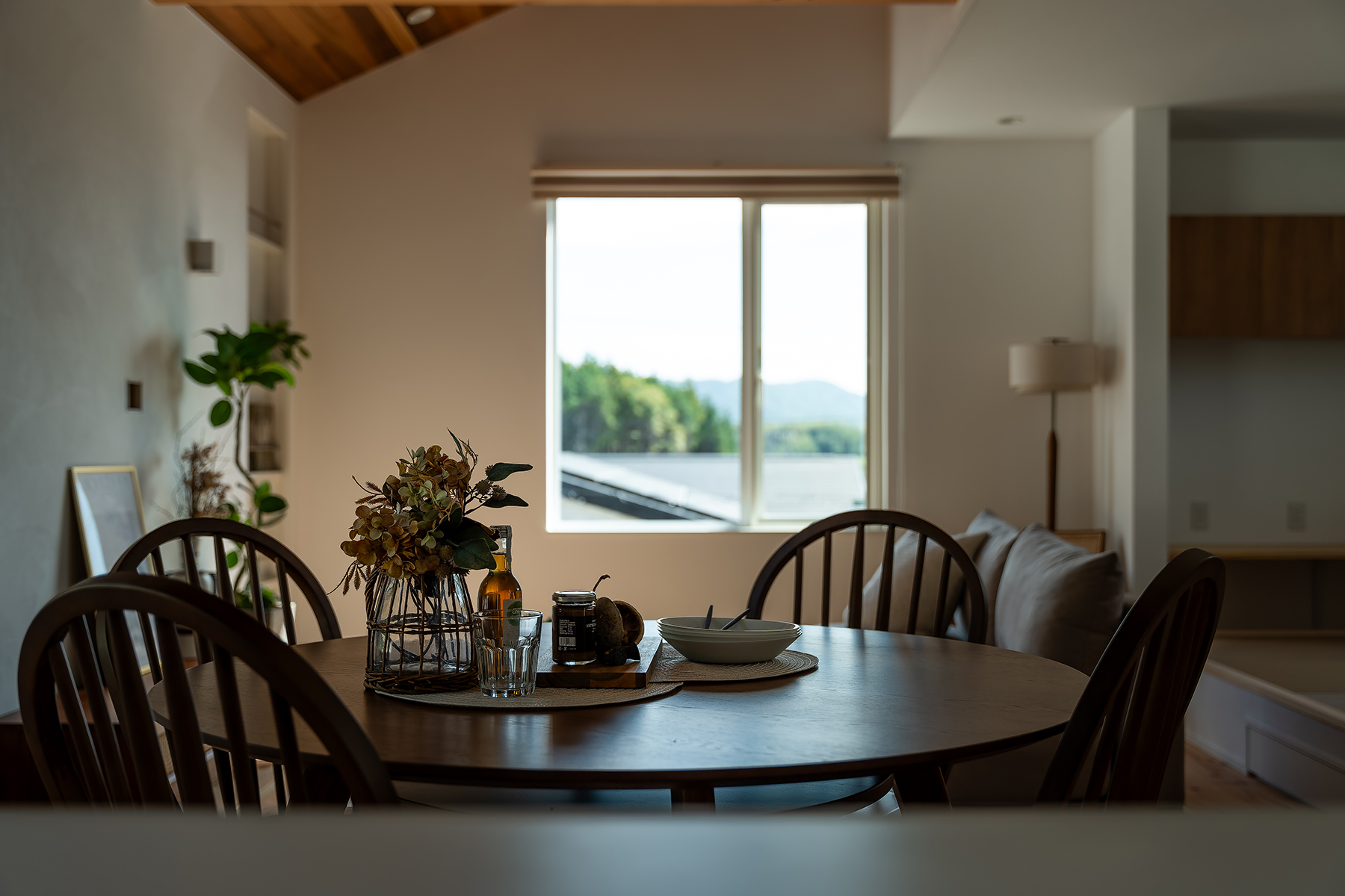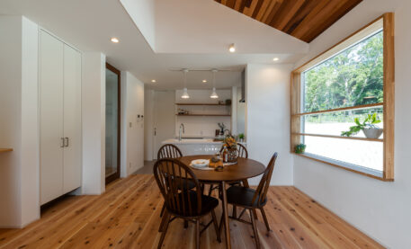 勾配の緩やかな開けた団地の一角、緑が美しく見える静かな角地に佇むT様邸。 周囲を気にせずのびのびと過ごせるようリビングは2階に配置。プライベートを保ちつつ、勾配天井にすることで明るさと開放感も感じられる空間になっている。 大之木ダイモが提案する無垢の木や漆喰などの自然素材を気に入ってくださり、床や壁などの内装はモデルハウス仕様に。間取りだけでない暮らしの心地よさもプラスされた。 さらに、団地の中にありながら自然豊かな立地は、四季の移ろいを身近に感じられて日々の暮らしにも彩りを添えてくれる。 T様ご家族のこれからの暮らしが楽しみなお家となった。