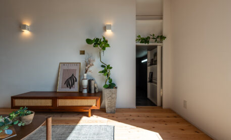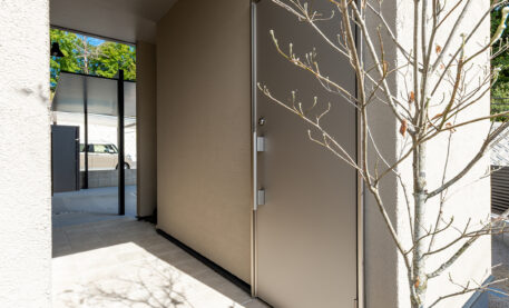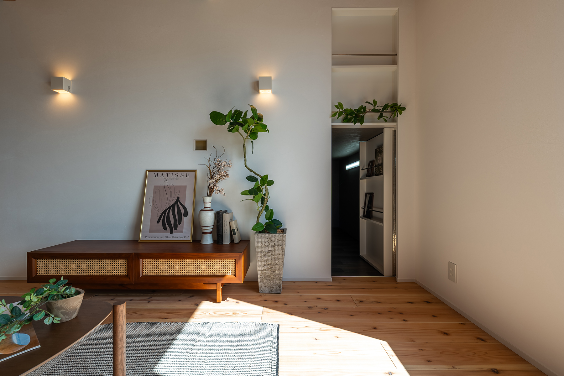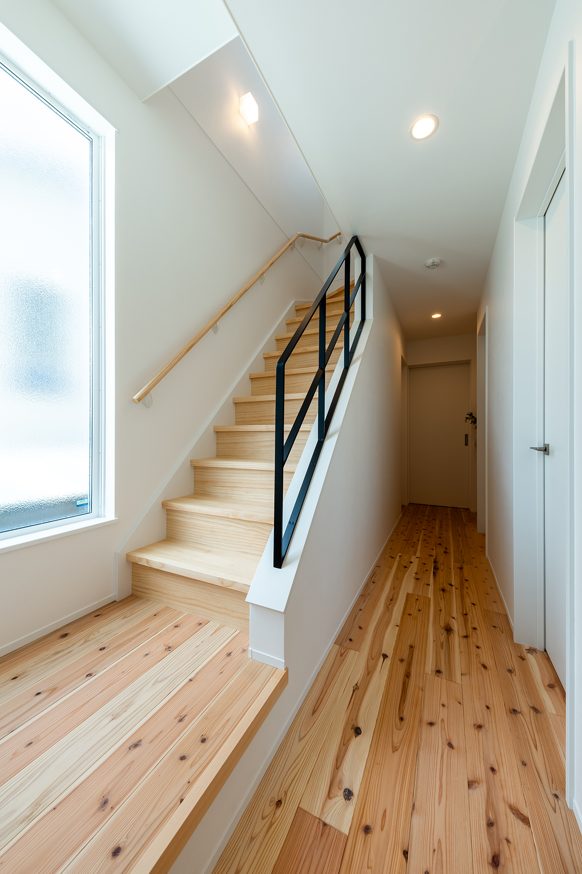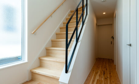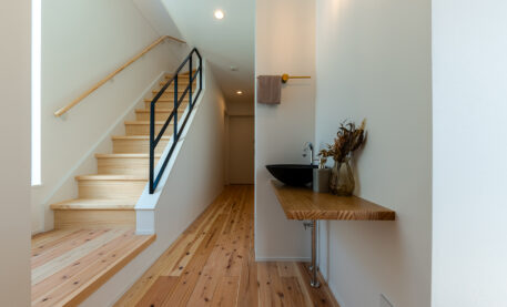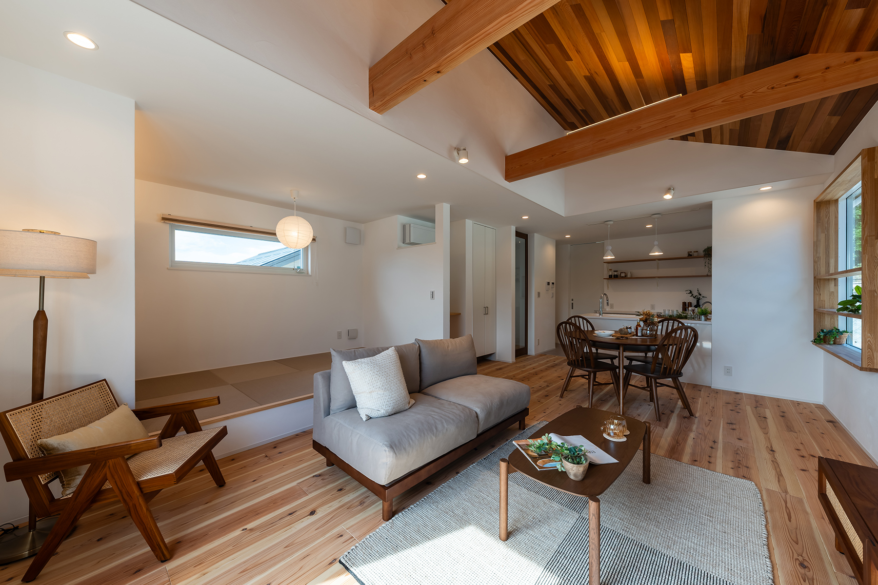 勾配の緩やかな開けた団地の一角、緑が美しく見える静かな角地に佇むT様邸。 周囲を気にせずのびのびと過ごせるようリビングは2階に配置。プライベートを保ちつつ、勾配天井にすることで明るさと開放感も感じられる空間になっている。 大之木ダイモが提案する無垢の木や漆喰などの自然素材を気に入ってくださり、床や壁などの内装はモデルハウス仕様に。間取りだけでない暮らしの心地よさもプラスされた。 さらに、団地の中にありながら自然豊かな立地は、四季の移ろいを身近に感じられて日々の暮らしにも彩りを添えてくれる。 T様ご家族のこれからの暮らしが楽しみなお家となった。
