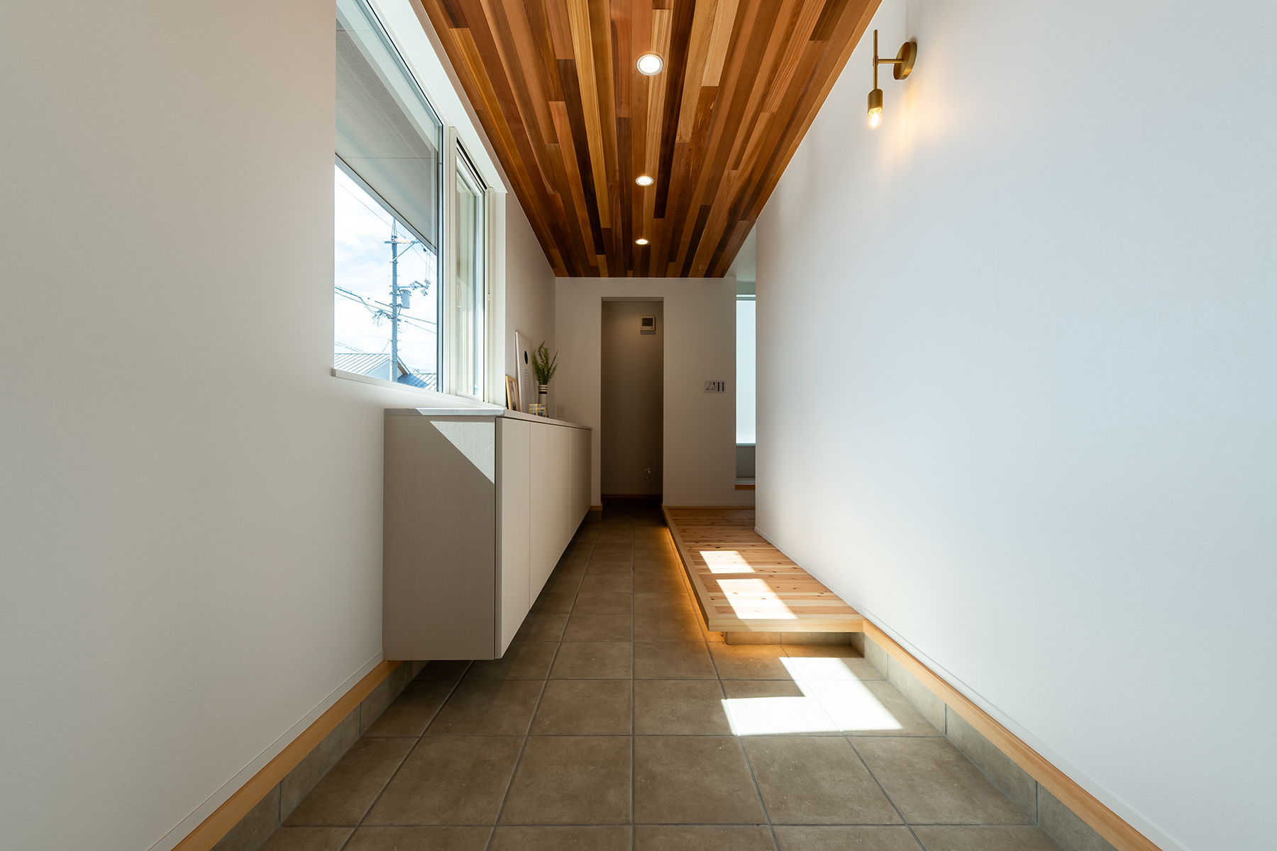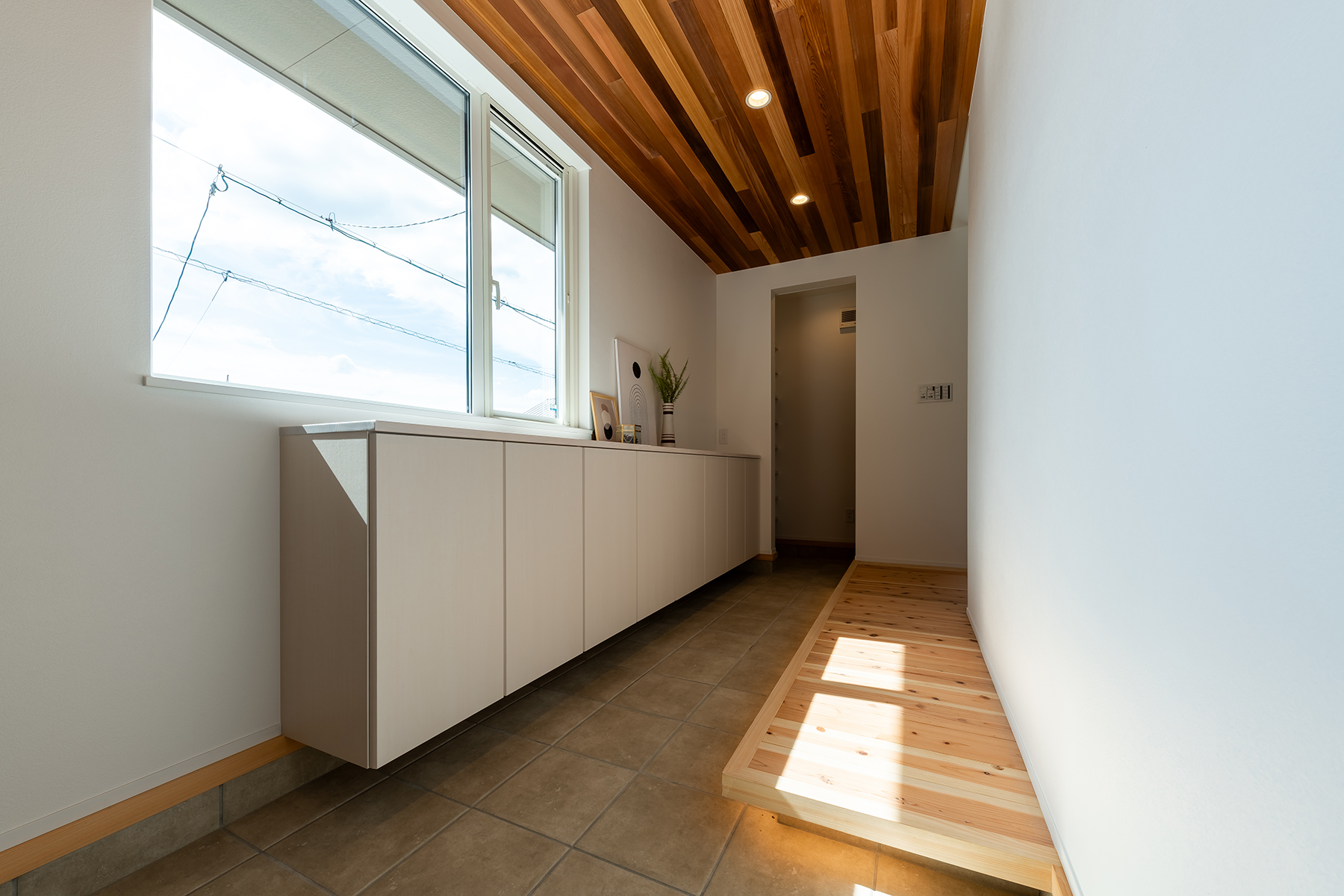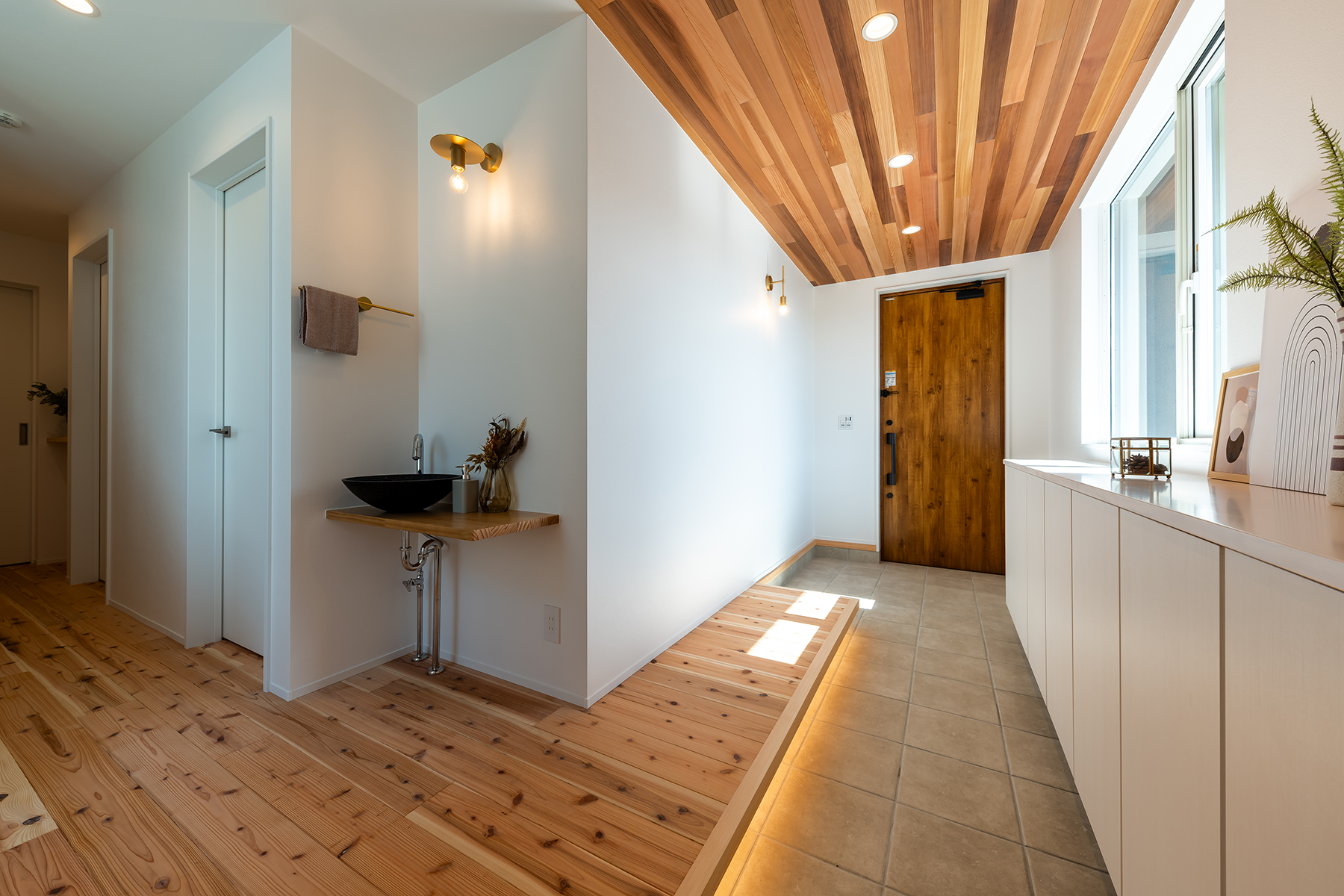 天井にはったレッドシダーが特別感を感じさせる玄関ホール。広い土間と大きな窓が来客を明るく出迎えてくれる。夜には足元の間接照明やペンダント照明の光でまた違う雰囲気が楽しめる。 扉付きのカウンター収納の収納力に加え、奥には隠せるシューズクロークも設けているので用途に合わせて物の置き場所を変えることができる。 広い土間や壁を使って様々なものを置いたり飾ったりと、使い勝手抜群の玄関になった。