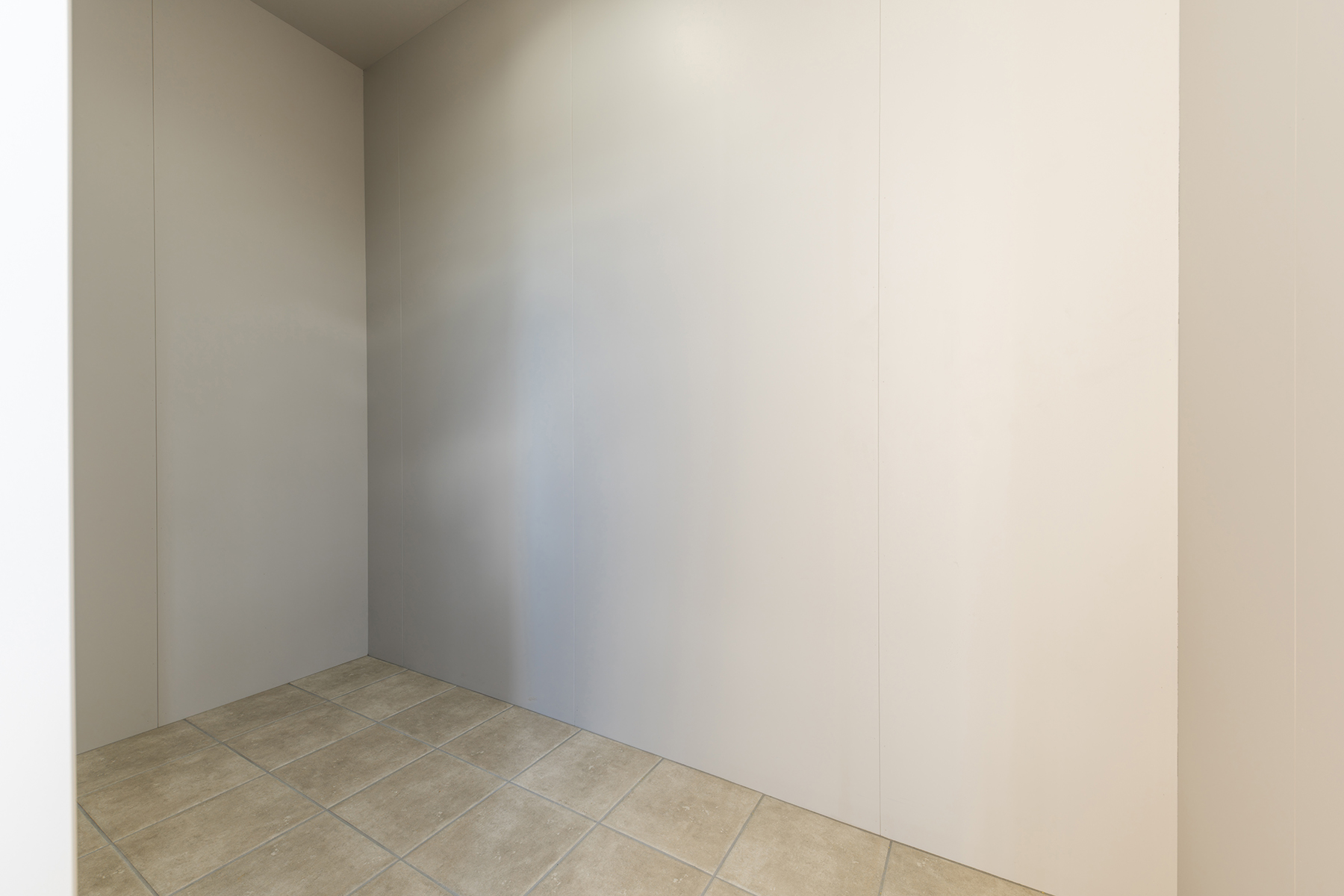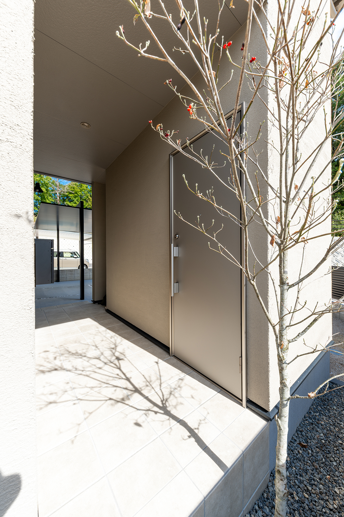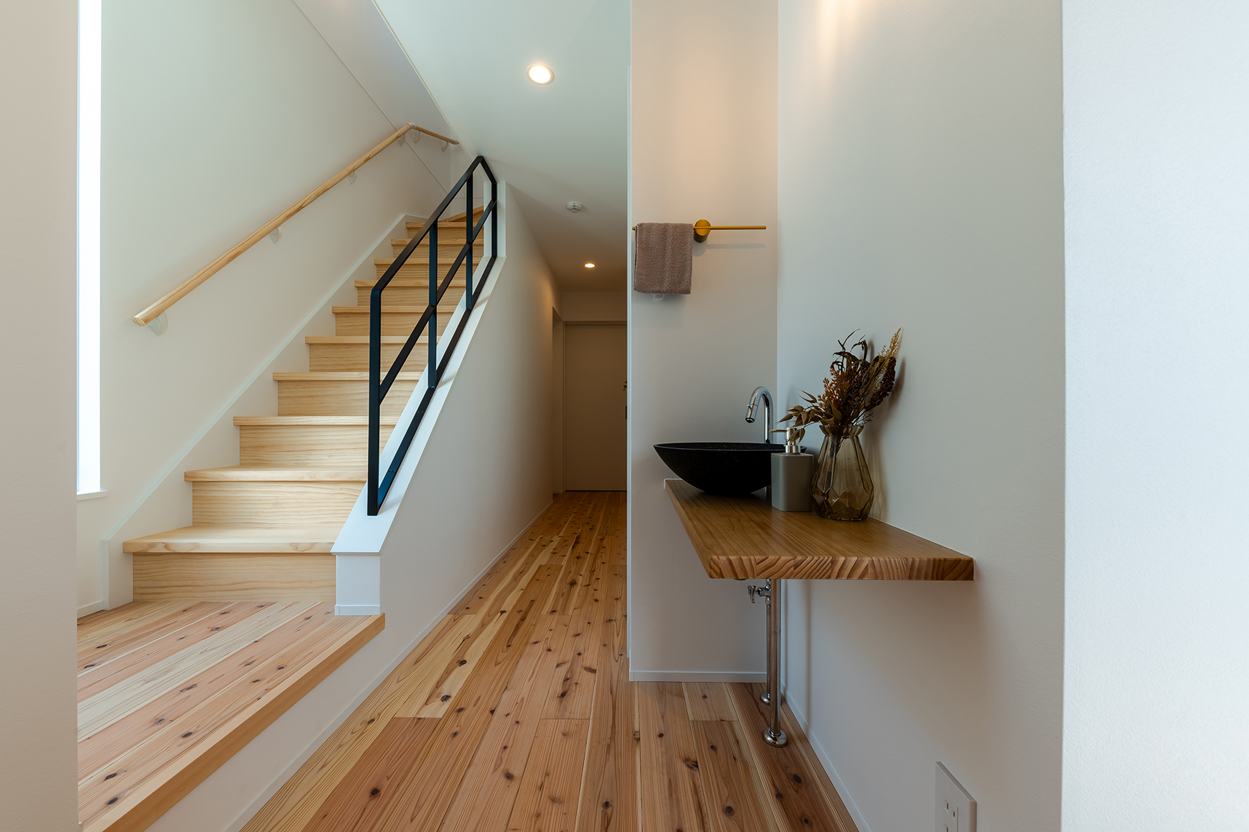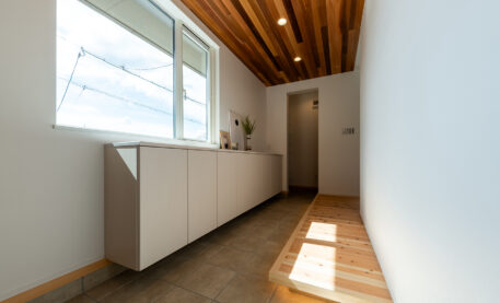 天井にはったレッドシダーが特別感を感じさせる玄関ホール。広い土間と大きな窓が来客を明るく出迎えてくれる。夜には足元の間接照明やペンダント照明の光でまた違う雰囲気が楽しめる。 扉付きのカウンター収納の収納力に加え、奥には隠せるシューズクロークも設けているので用途に合わせて物の置き場所を変えることができる。 広い土間や壁を使って様々なものを置いたり飾ったりと、使い勝手抜群の玄関になった。