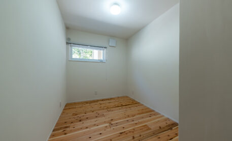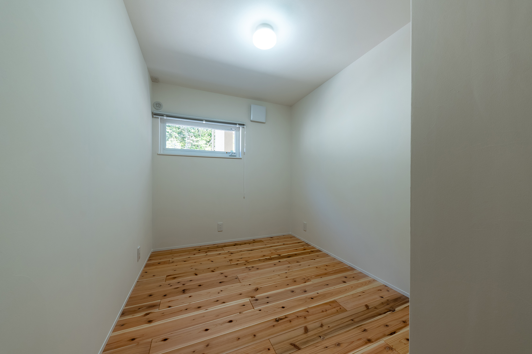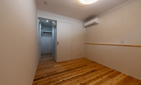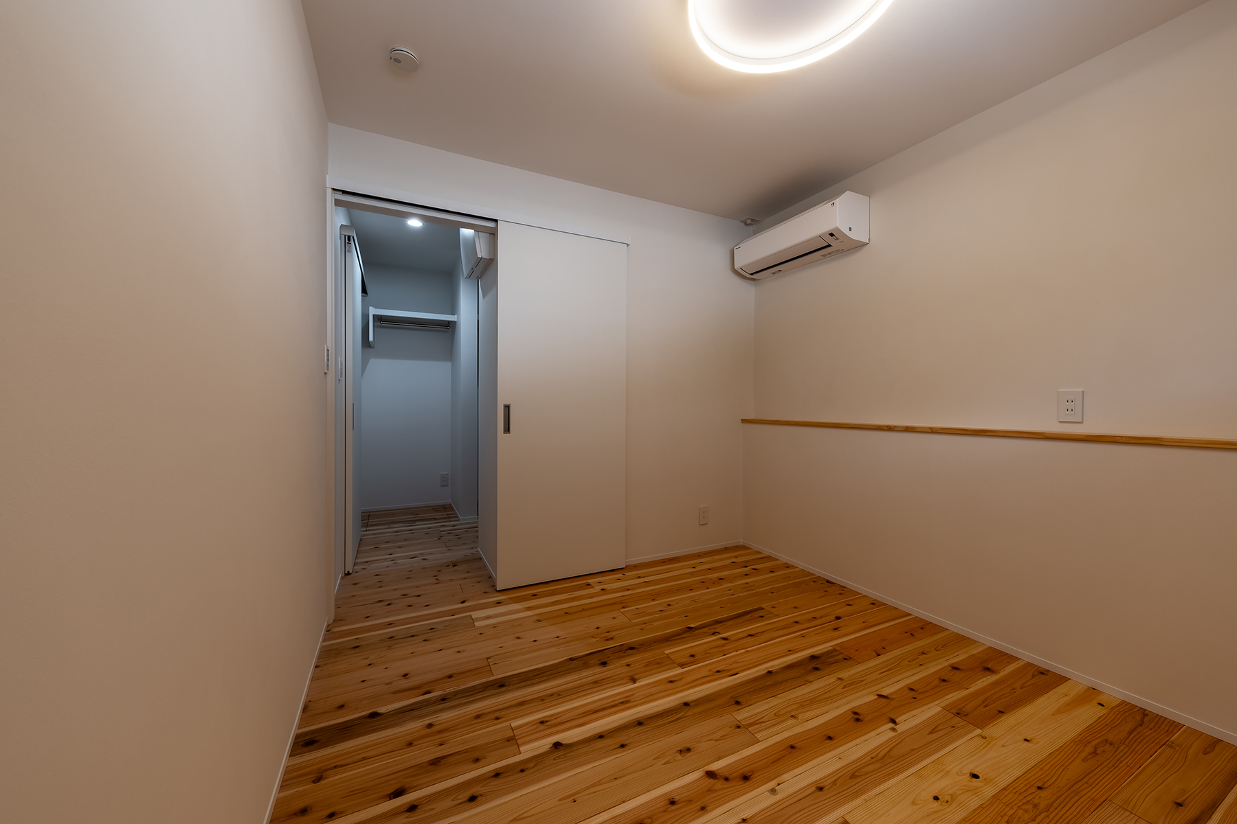 奥まった位置にあるので1階でも落ち着いて過ごせる主寝室。枕元には造作でカウンターをつくり、携帯や小物などを置いておける。ローカからWIC、WICから主寝室の入口2箇所にはそれぞれ扉がついているので来客があっても安心。