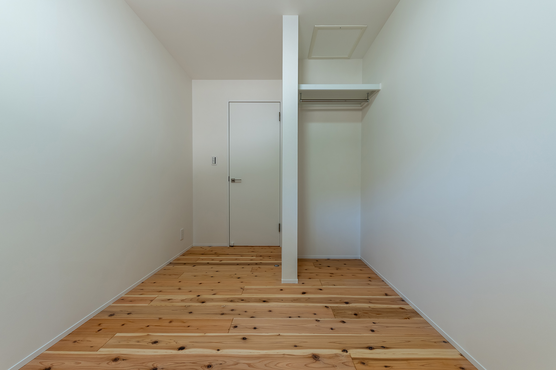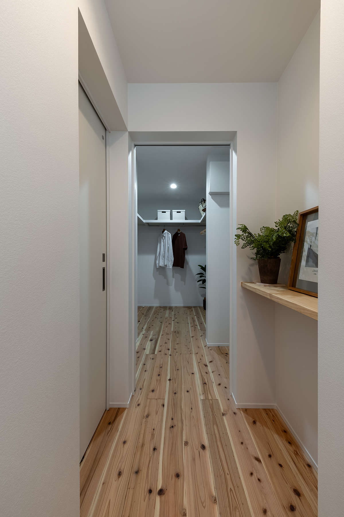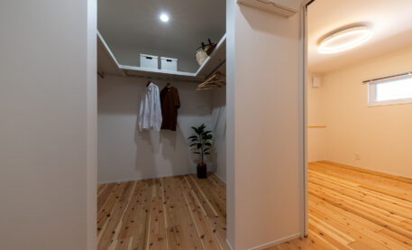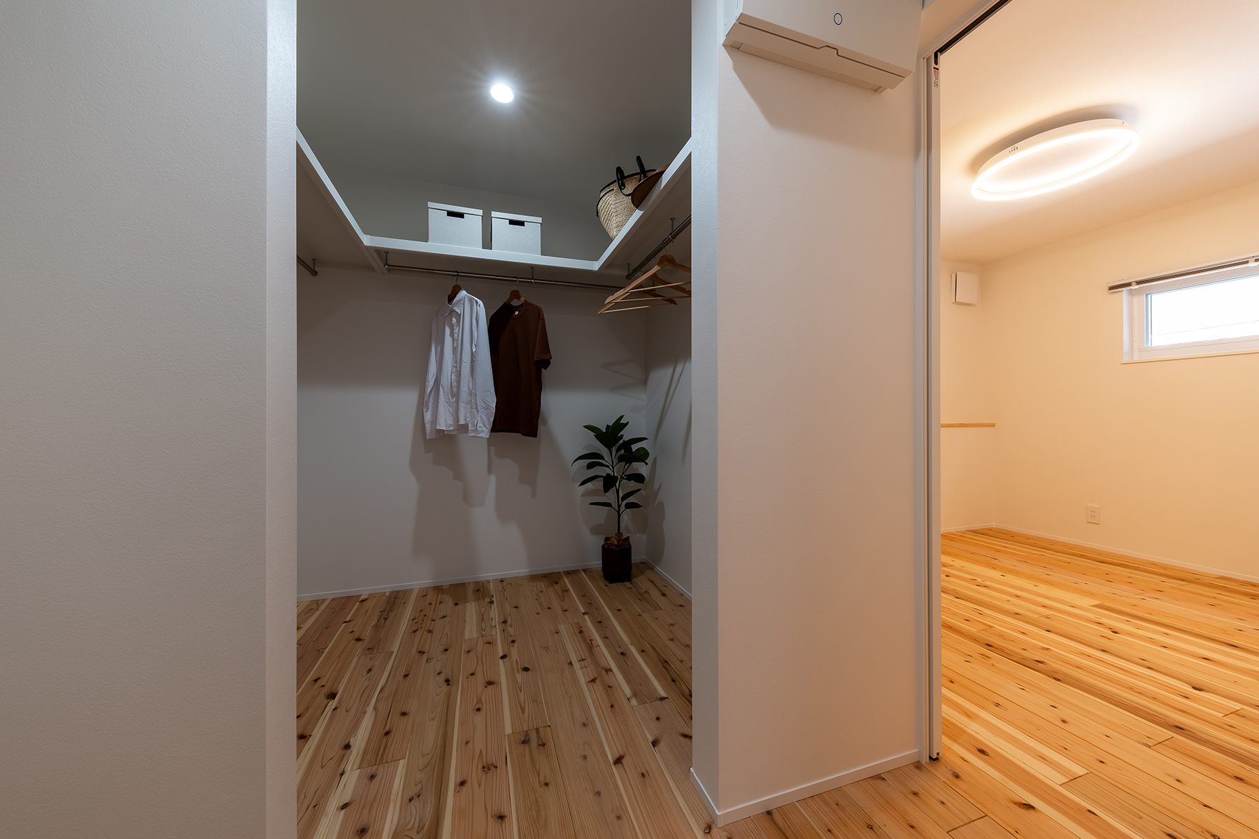 1階に設けた3.75帖の大容量WIC。物の出し入れがしやすいよう、ローカからすぐの場所に配置している。3面にパイプハンガーと枕棚が付いているので、洋服をかけたり上部に小物を置いたり、下部のスペースを利用して衣装ケースを置いたりと用途に合わせて収納できる。