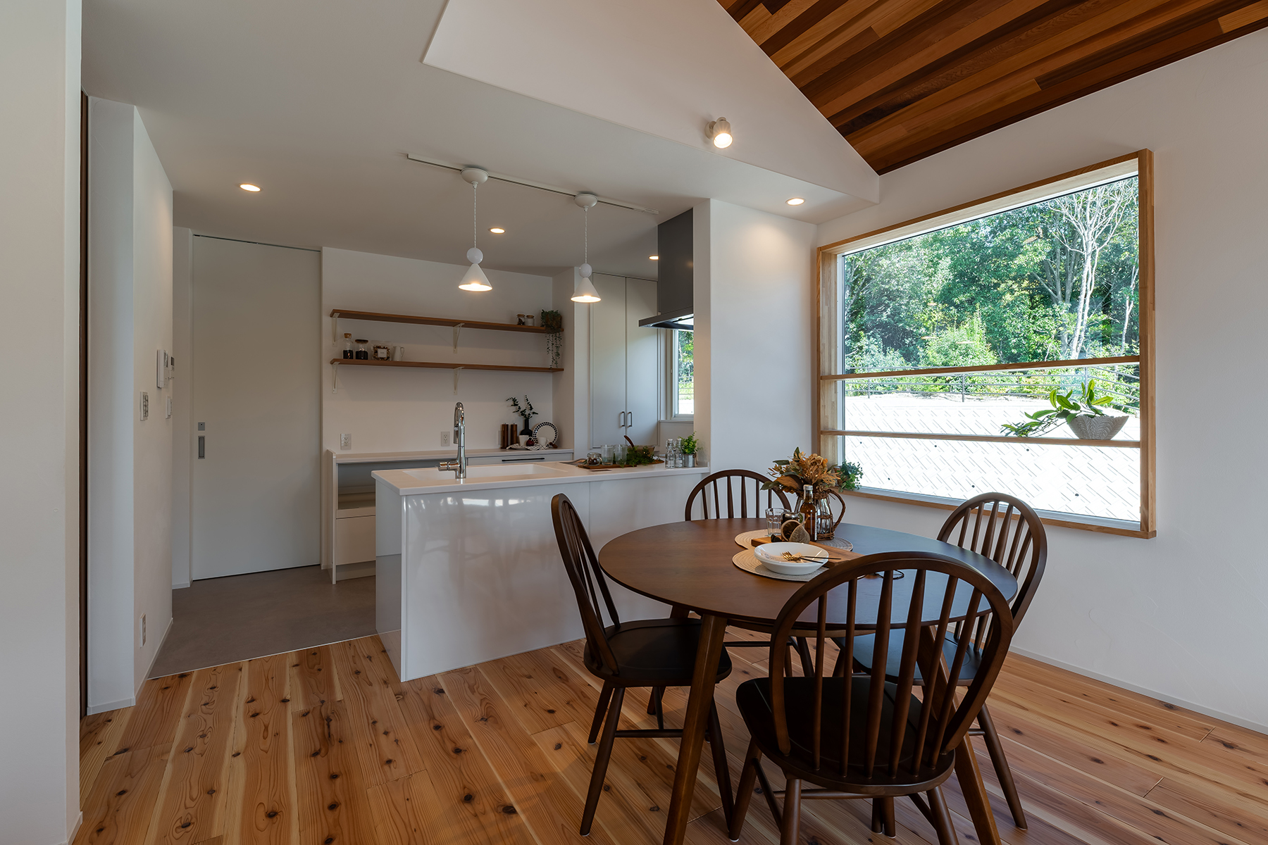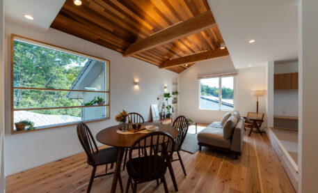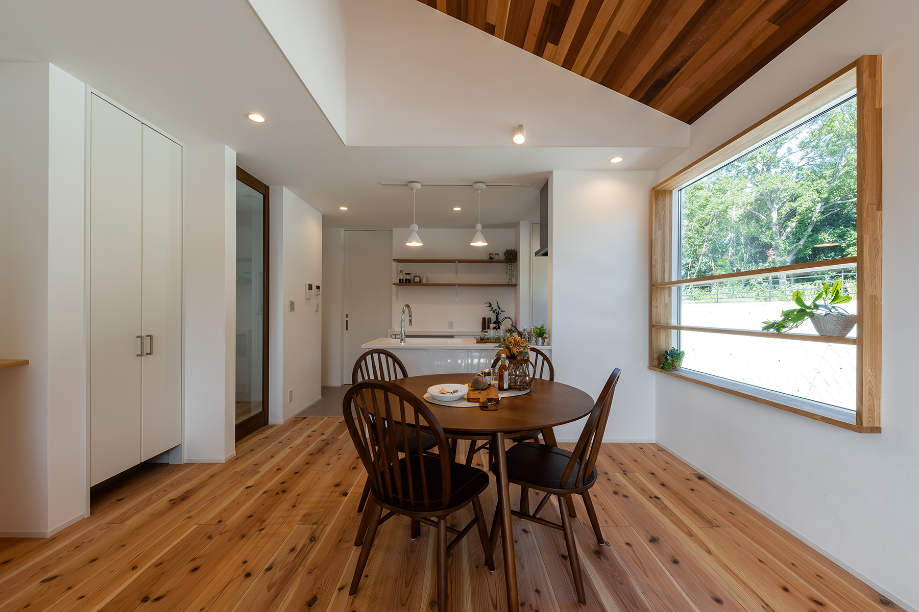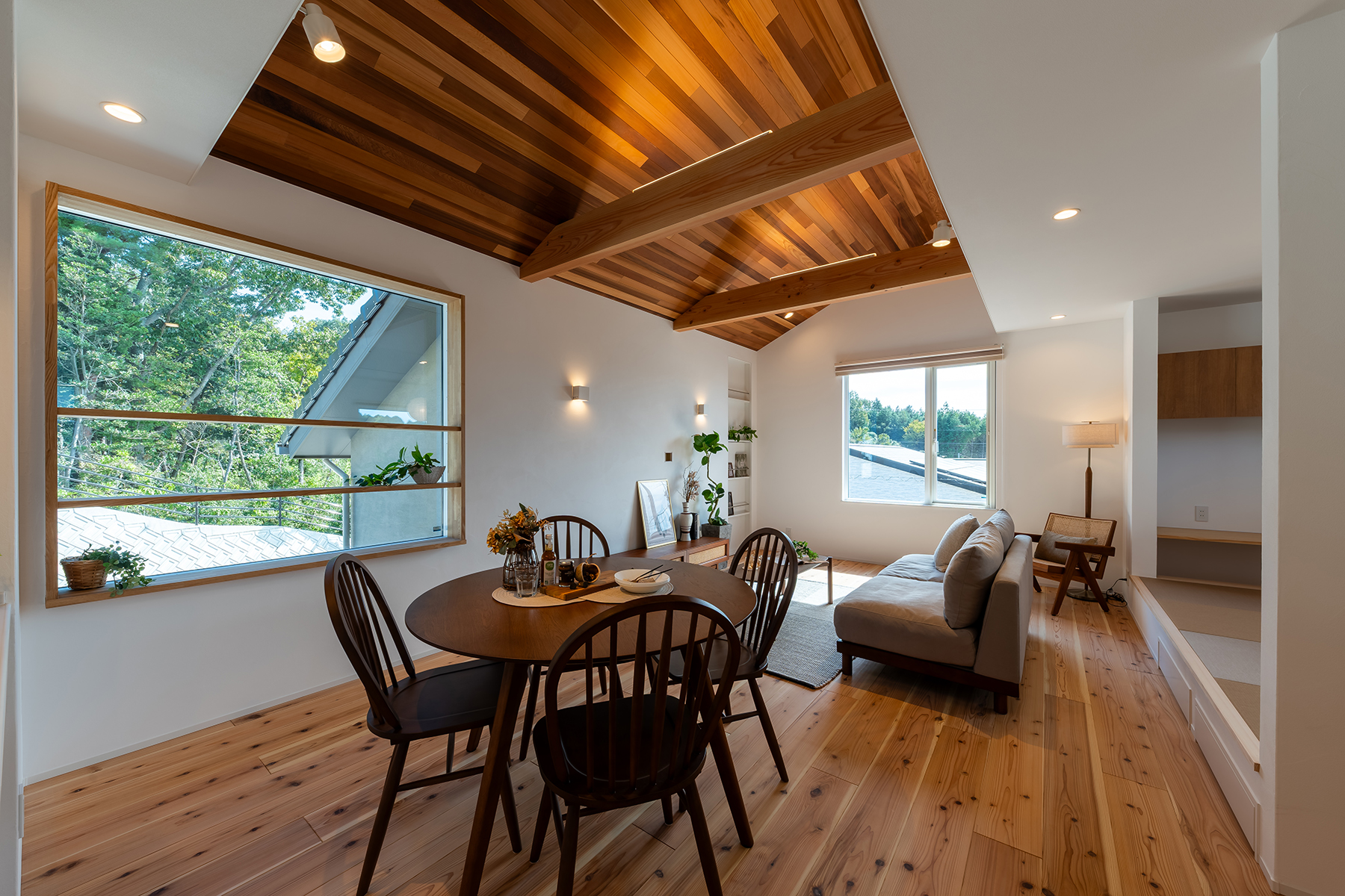 階段を上がってガラスの引き戸越しによく見える開放的なLDK。 リビングダイニングの天井は勾配天井にレッドシダーを貼ることで、開放感とインパクトが感じられる。 どこの窓からも緑が見え、自然の豊かさを感じながら暮らせる空間になっている。