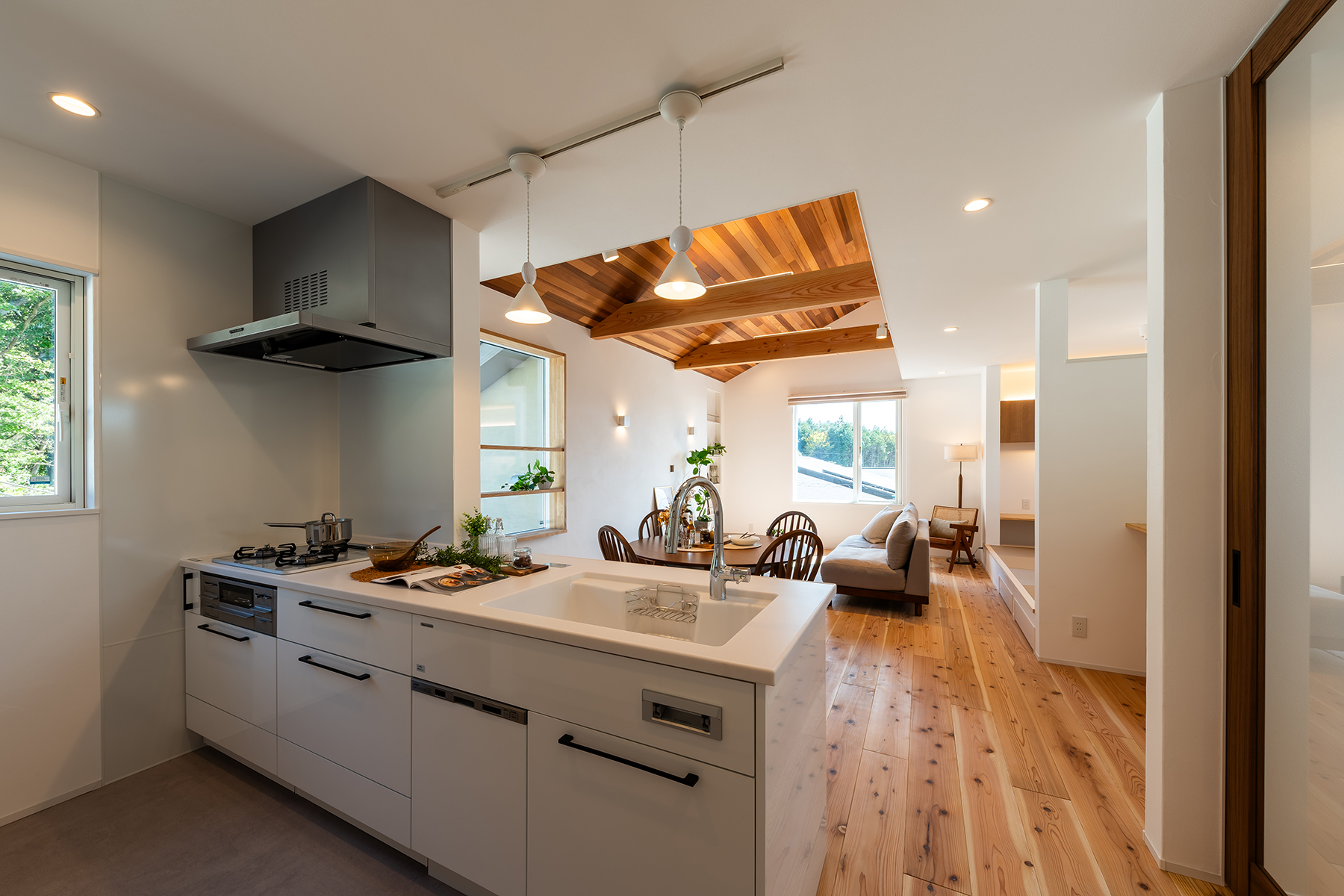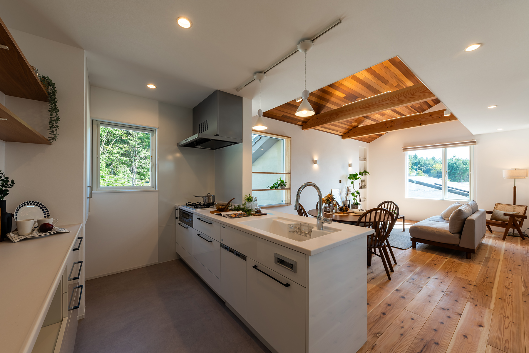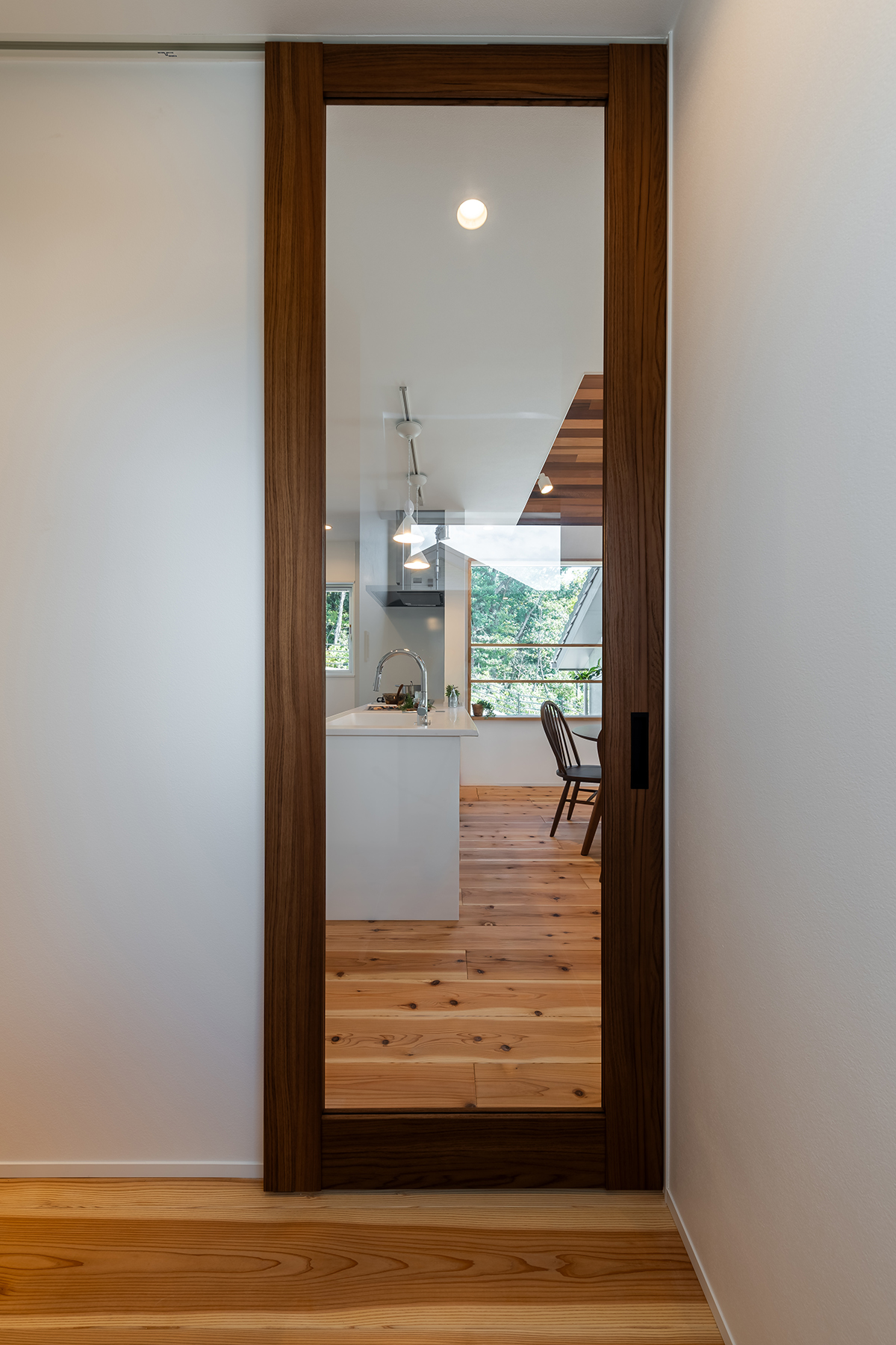 階段を上がってガラスの引き戸越しによく見える開放的なLDK。 リビングダイニングの天井は勾配天井にレッドシダーを貼ることで、開放感とインパクトが感じられる。 どこの窓からも緑が見え、自然の豊かさを感じながら暮らせる空間になっている。