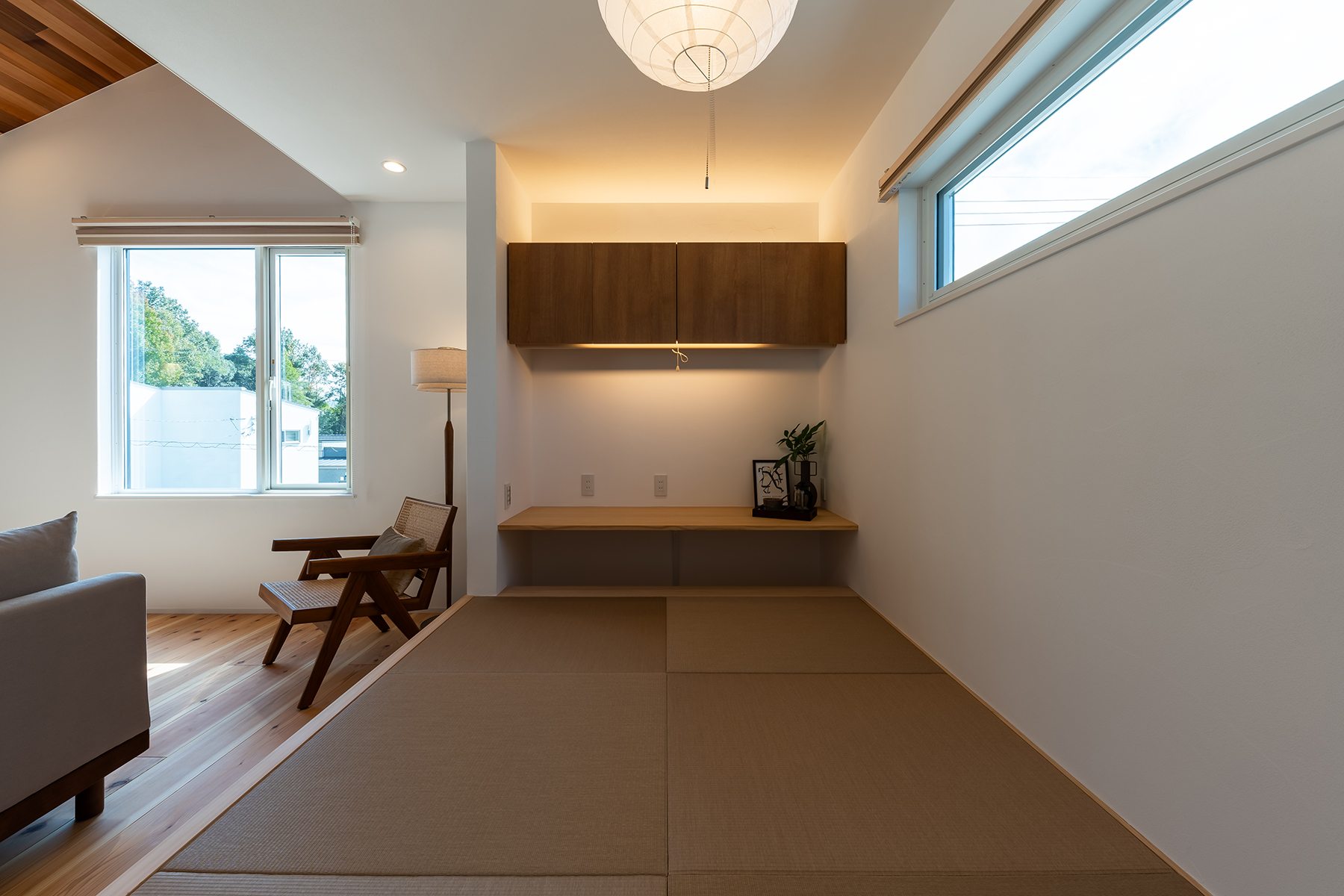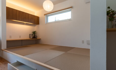 リビングから一段小上がりになった、オープンタイプのタタミコーナー。 カウンター部分はテレワークスペースとしても活用でき、掘りごたつのように足元が下がっているので長時間座っても疲れにくい。パソコンなどを置いたままでもロールスクリーンを下げて隠すことができ、夜には間接照明を付けて落ち着いた雰囲気にもできる。