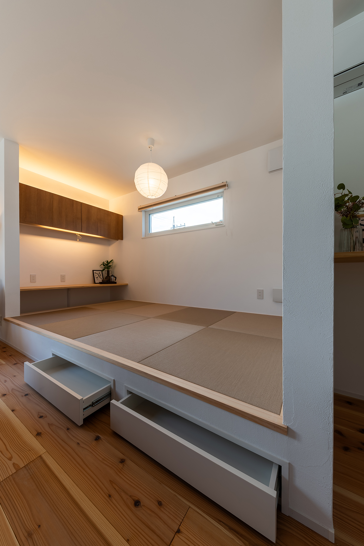 ごろっと寝ころんでも余裕のある広さで、疲れた時やお昼寝などちょっとした時にも2階でそのまま休めて使いやすい。 小上がり部分を利用した引き出しが2か所あり、細々したものを収納することもできる。