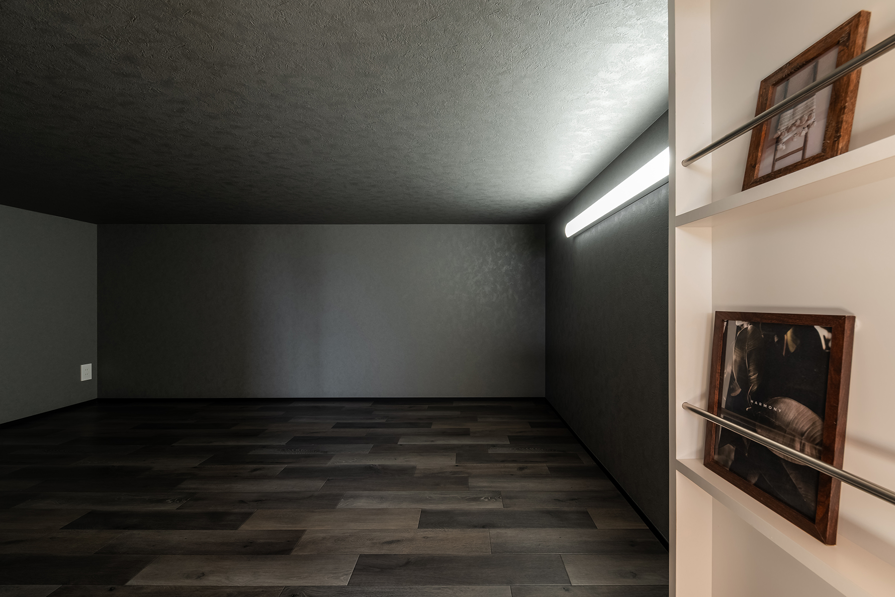 リビングにある本棚が隠し扉になった、遊び心のある収納スペース。 LDKとはまた違う雰囲気の空間で、ストーブや扇風機などのシーズン物を収納したり、時には暗さを活かしてシアタールームとしても使える。