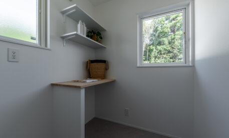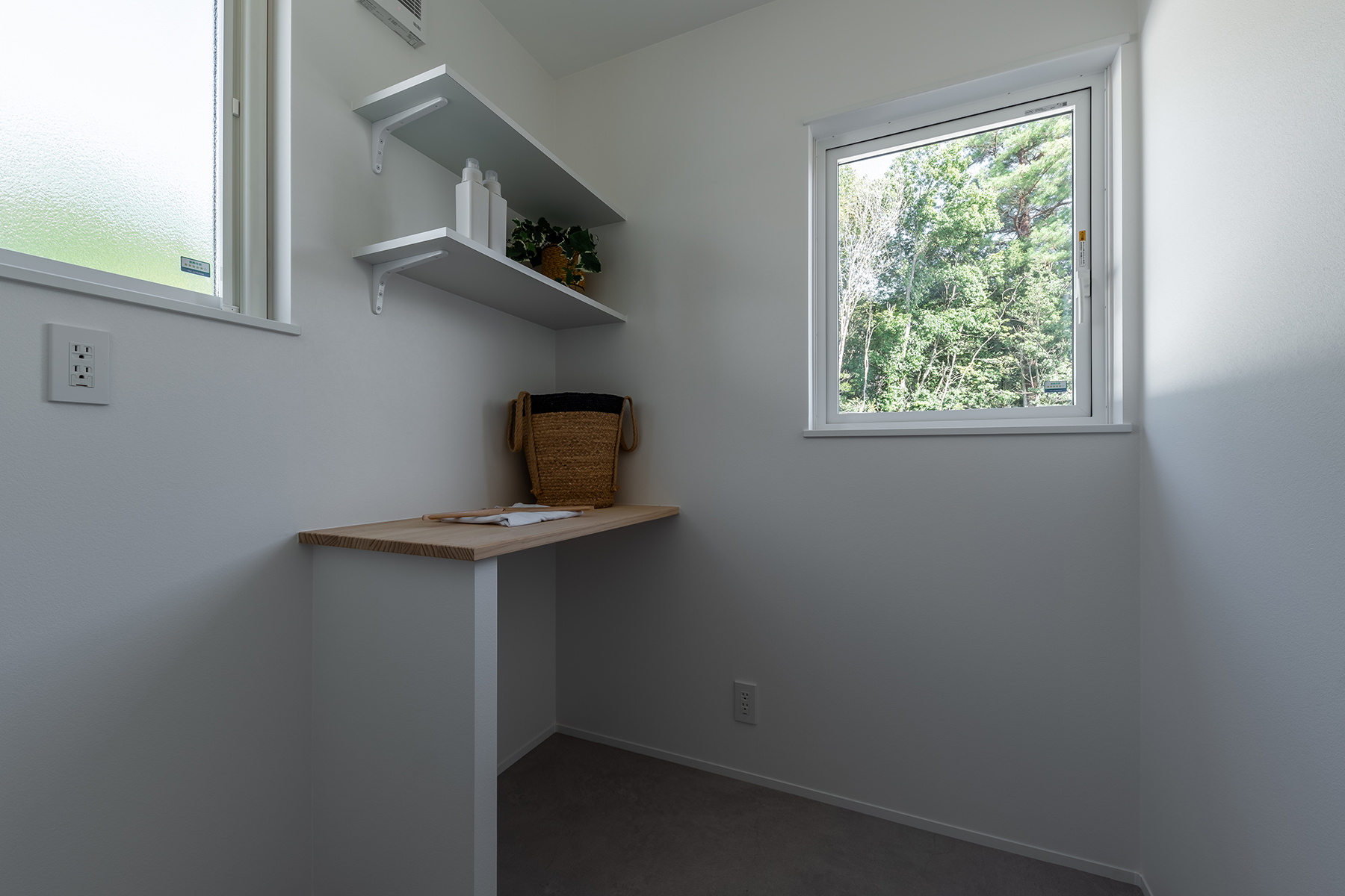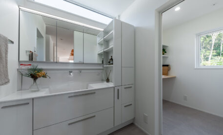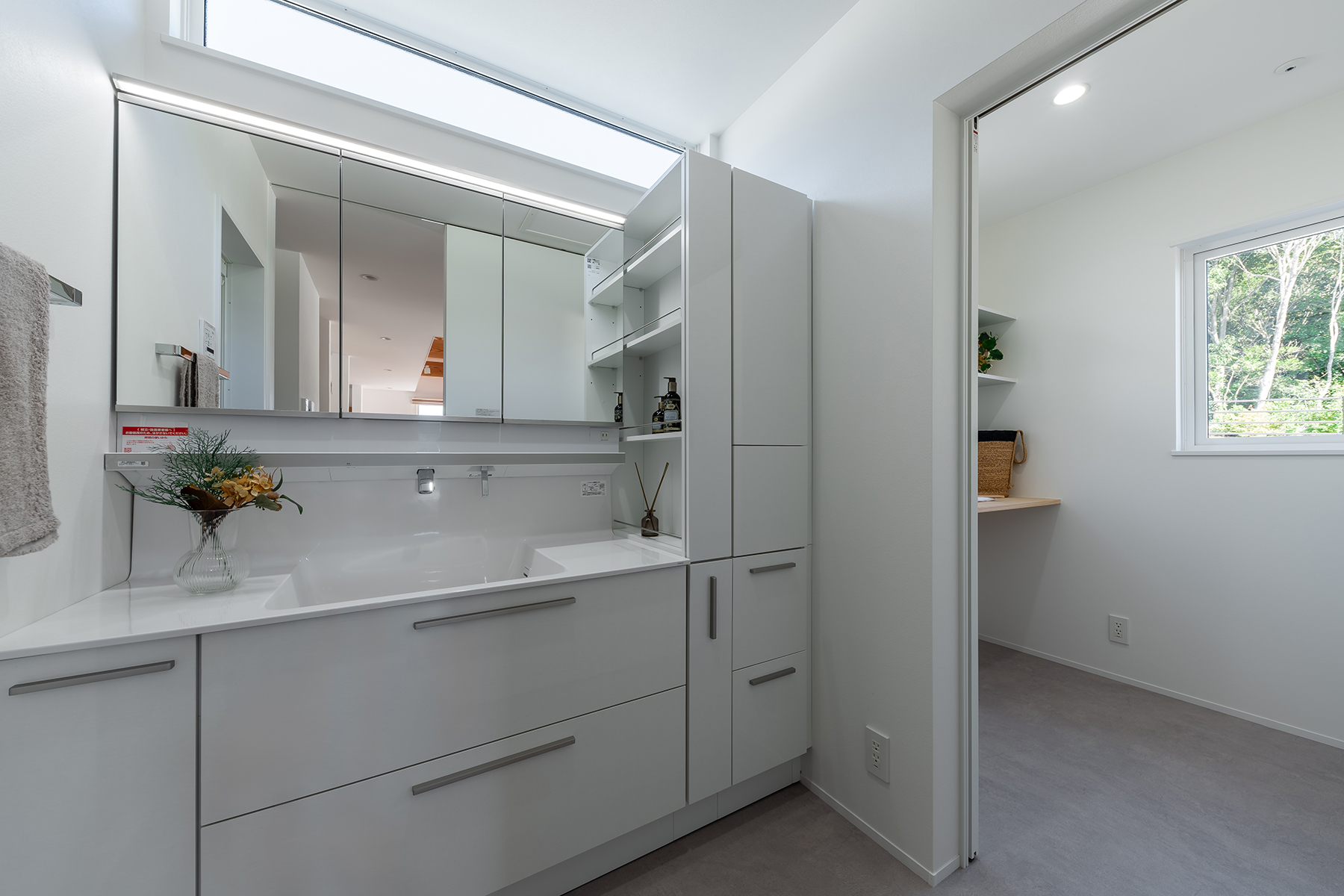 北側に集中させ、家事がしやすいようにした洗面脱衣室。北面でも程よく高い位置に窓を取り、隣家の視線を遮りつつ明るい雰囲気になっている。 洗面化粧台は三面鏡に収納が充実したタイプを採用することで、物を露出させずに収納でき、いつでも清潔に使うことができる。