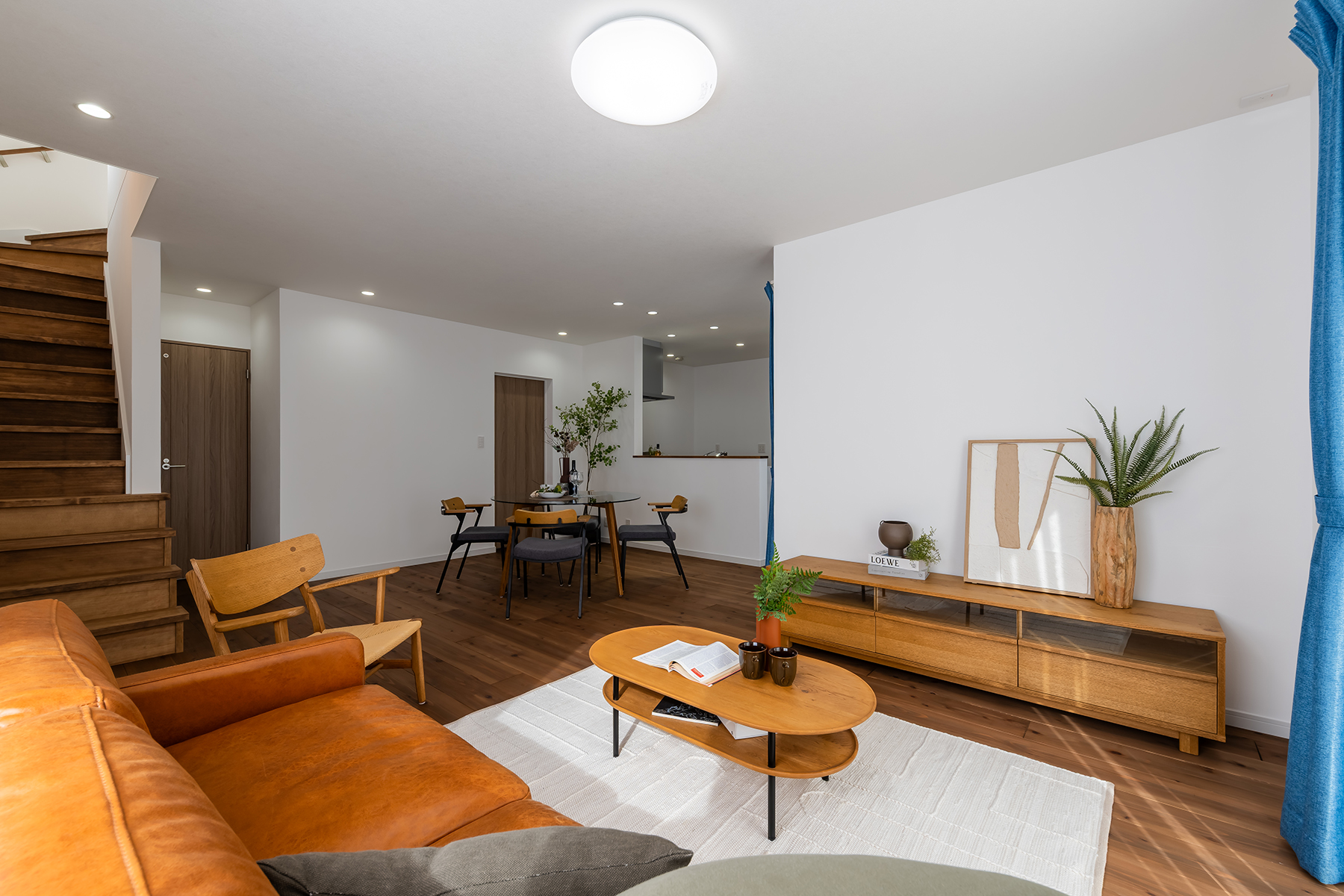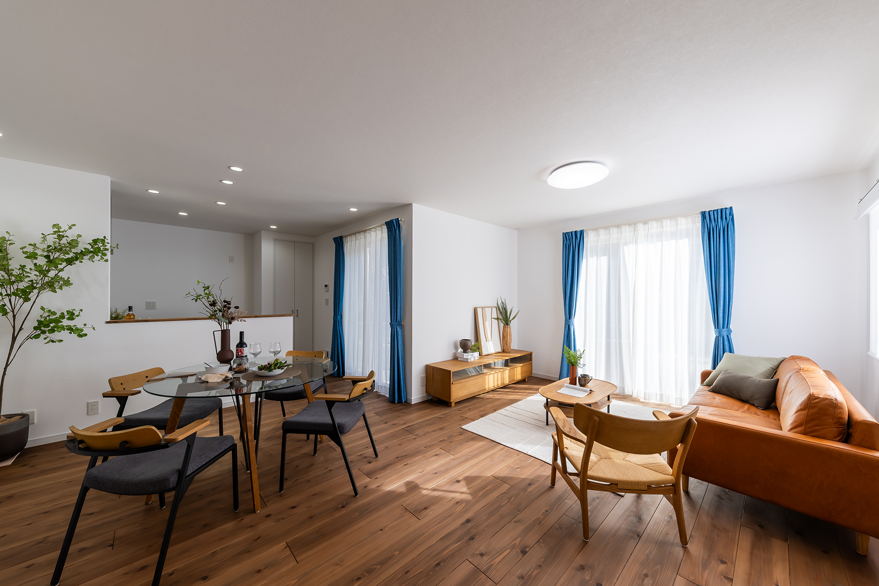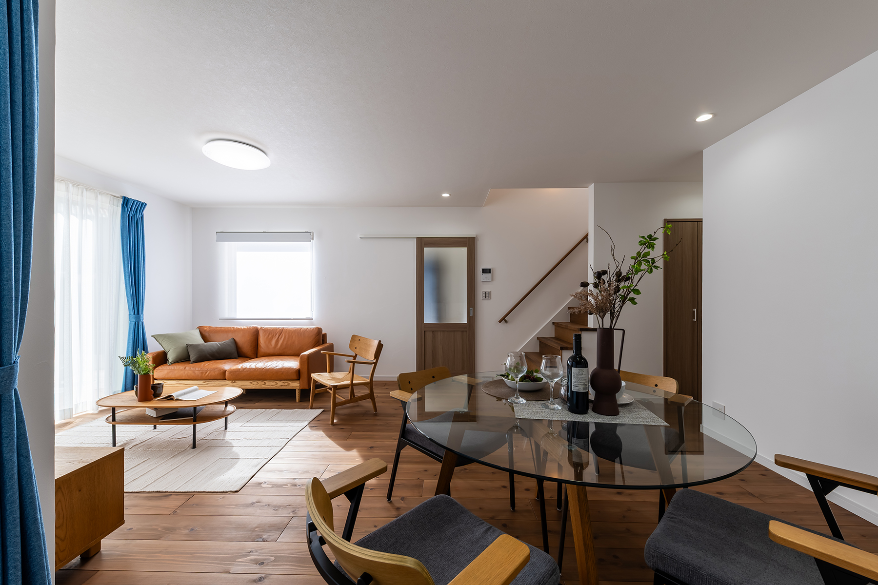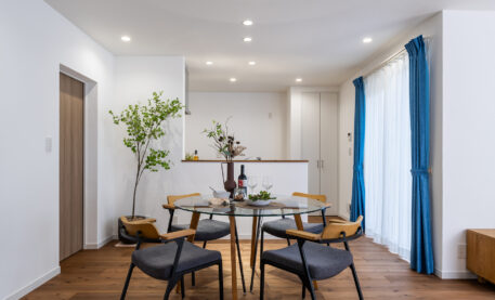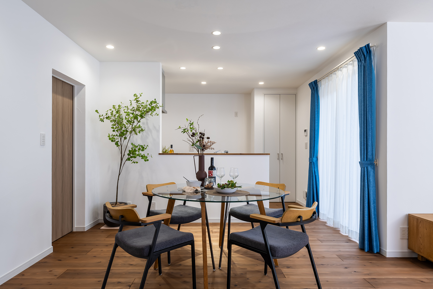 分譲地の中でも1日中陽当たりの良い場所を選び、緑を楽しめるように考えられたH様邸。 リビングに大きな窓を設けることで朝昼夕といつでも日の光が楽しめるようになっている。 LDKもゆとりのある空間で、好きな場所でのんびり過ごしながらも、家族で声かけがしやすい ほどよい距離感と配置にこだわった。 WICを1階2階ともに設けた充実の収納空間、遊び心のあるクロス使いなど、日常がより豊かになる工夫がたくさん詰まったお家。 お家時間が楽しく過ごせるお家となった。