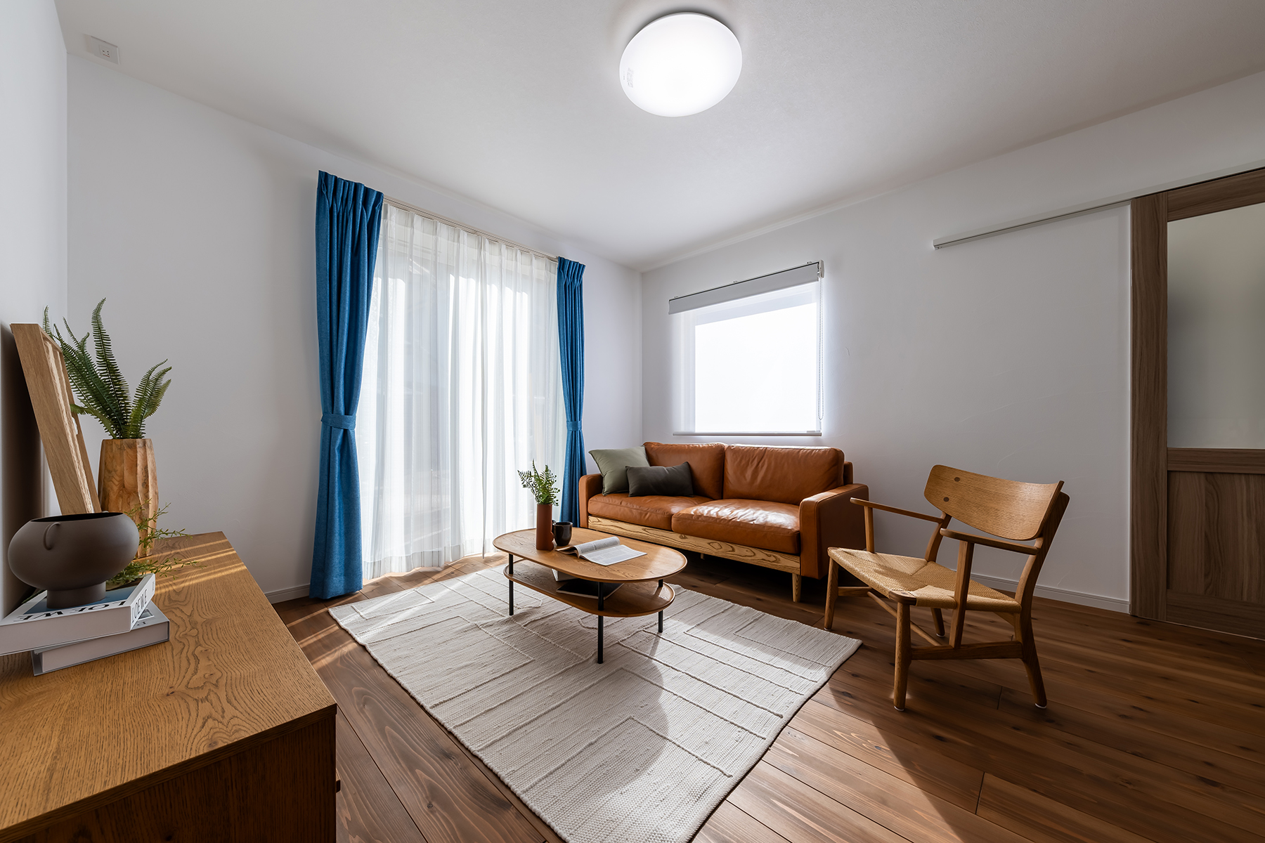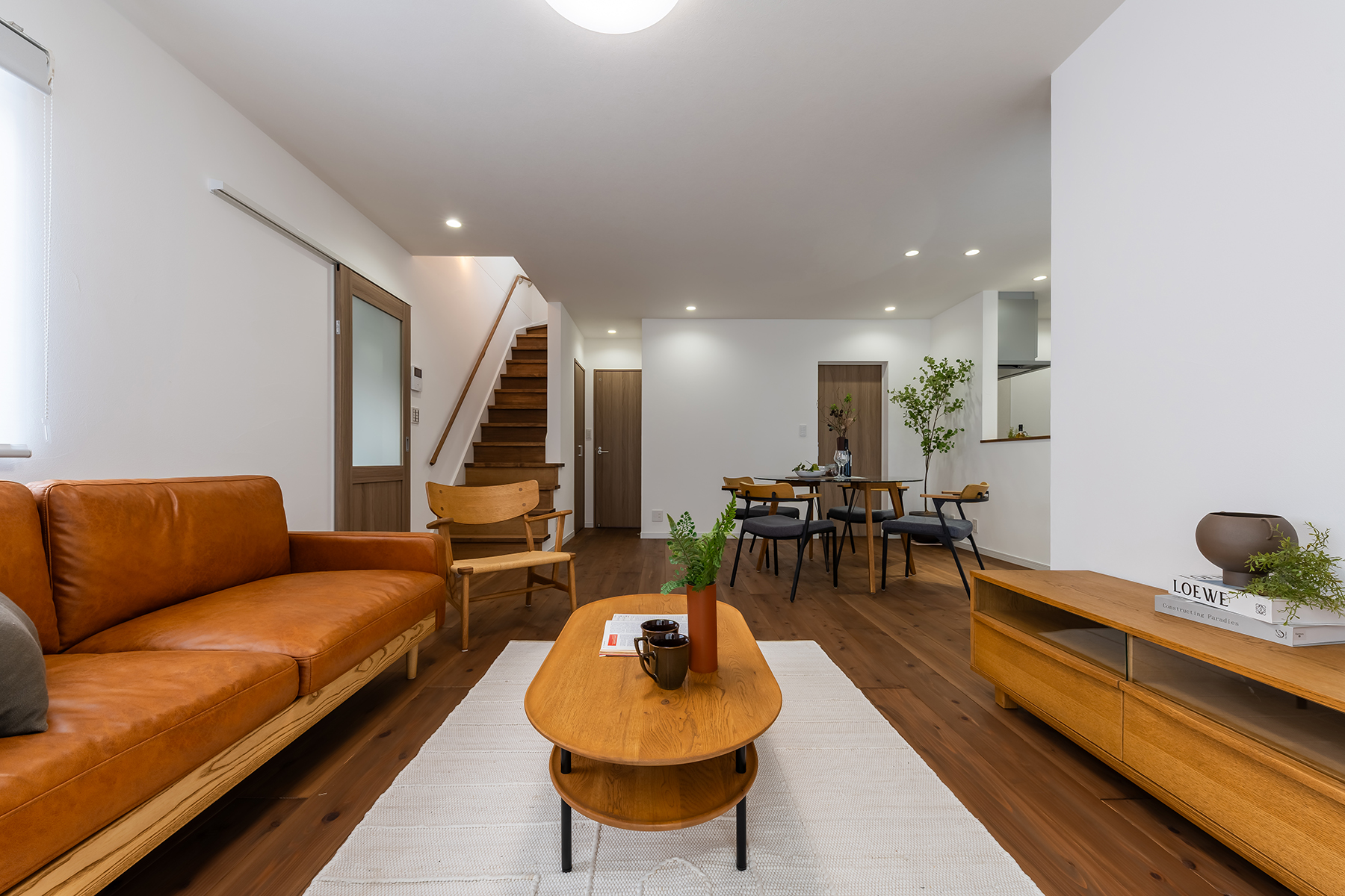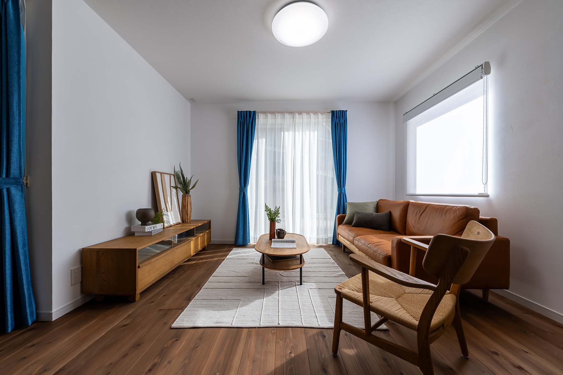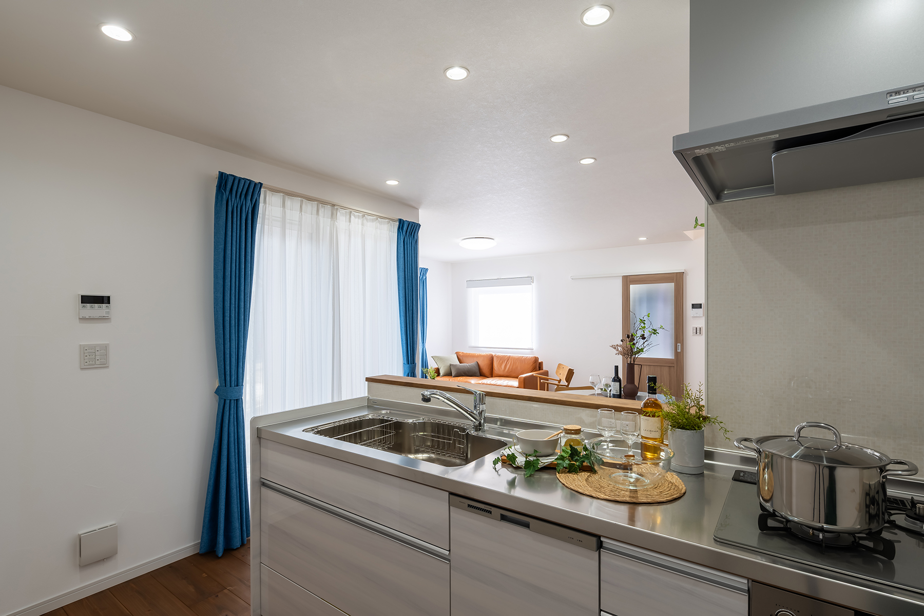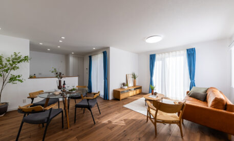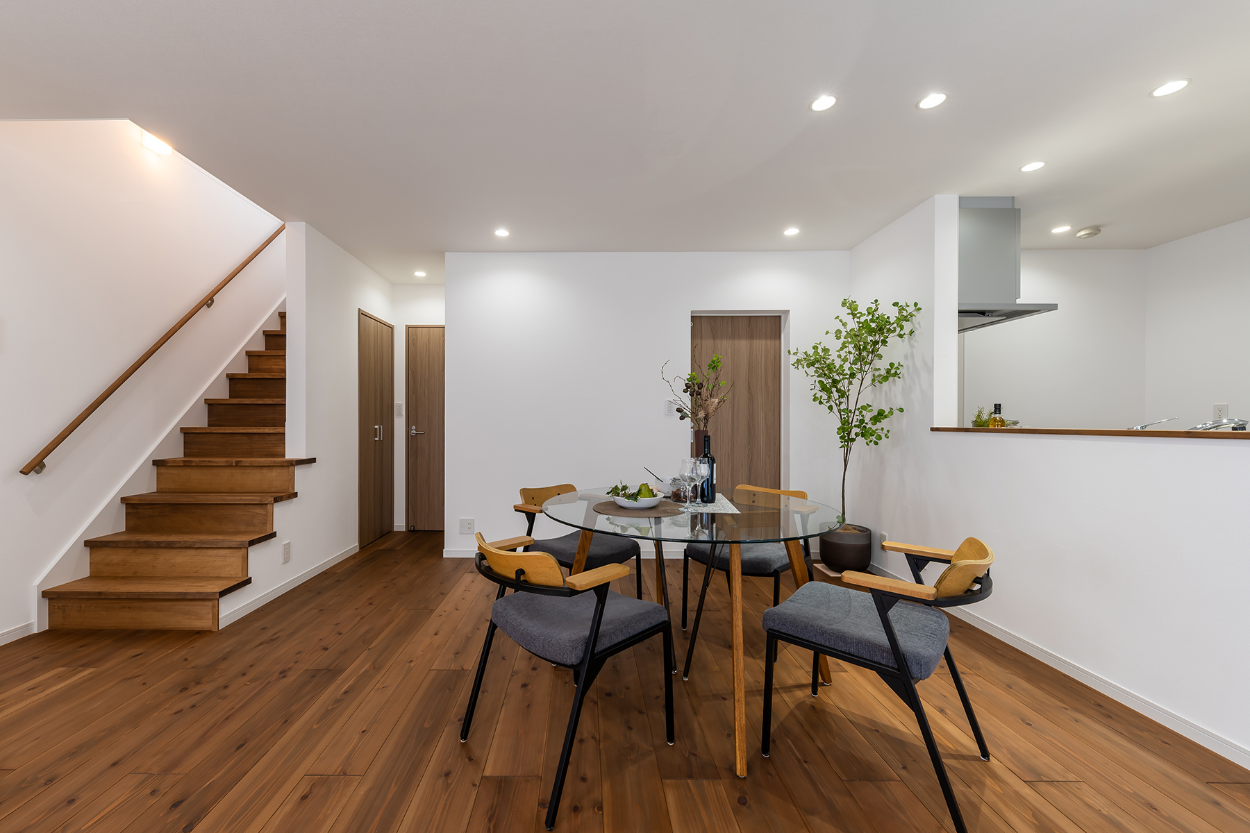分譲地の中でも1日中陽当たりの良い場所を選び、緑を楽しめるように考えられたH様邸。 リビングに大きな窓を設けることで朝昼夕といつでも日の光が楽しめるようになっている。 LDKもゆとりのある空間で、好きな場所でのんびり過ごしながらも、家族で声かけがしやすい ほどよい距離感と配置にこだわった。 WICを1階2階ともに設けた充実の収納空間、遊び心のあるクロス使いなど、日常がより豊かになる工夫がたくさん詰まったお家。 お家時間が楽しく過ごせるお家となった。