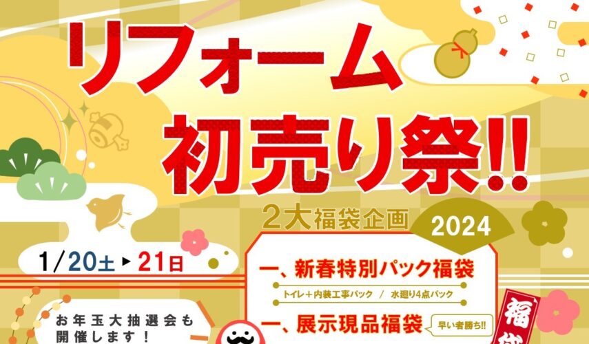 リフォーム初売り祭!!【2024年1月20日(土)~21日(日)】 Share ↑ ↑ ↑ 2024新春特別パック福袋企画実施!!詳しくはチラシをご覧ください! ↑ ↑ ↑ ↑ *******チラシ掲載商品ラインナップ******** ▼ご予約フォーム 予約希望日(必須) 時刻(必須) ---9:30~10:00~11:00~13:00~14:00~15:00~16:00~ 場所(必須) ---呉本店 ご検討中の工事内容(必須) ---水まわりのリフォーム屋根外壁塗装のリフォーム内装リフォーム外構リフォームその他のリフォーム お名前(必須) メールアドレス(必須) 電話番号(必須) メッセージ 入力内容を確認しました ※お電話・HPからのご相談、相談会開催日以外でのご来場のご予約も承っております。お気軽にご連絡ください。 ▼電話番号 0823-21-1413 ▼お問い合わせ お問い合わせ | 大之木ダイモ – 大正9年創立から広島と共に歩み続けて100周年。 (daimo.jp) ▼来店予約 来店予約 – 大之木ダイモ リフォーム (daimo.jp)