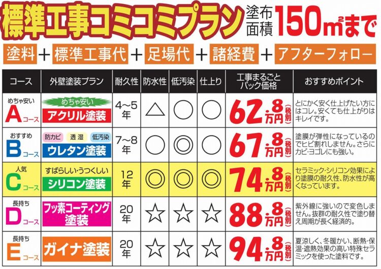 ただし耐久年数は4~5年とかなり短く、足場を組んで職人さん呼んで、また塗り替えて・・・を4~5年で繰り返すので、長い目で見ると、そんなに安いわけではなくなります。